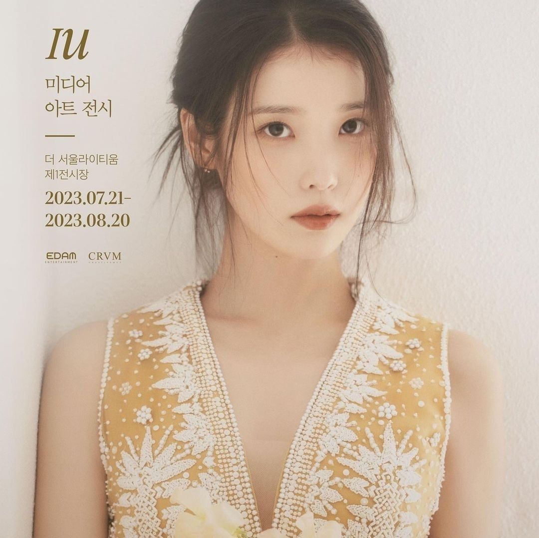 이번 15주년 전시회의 포스터에 아이유는 노란드레스에 화이트 자수와 화이트 비즈가 장식된 디자인을 입었는데 그녀의 이미지와 참 잘 어울렸습니다.
