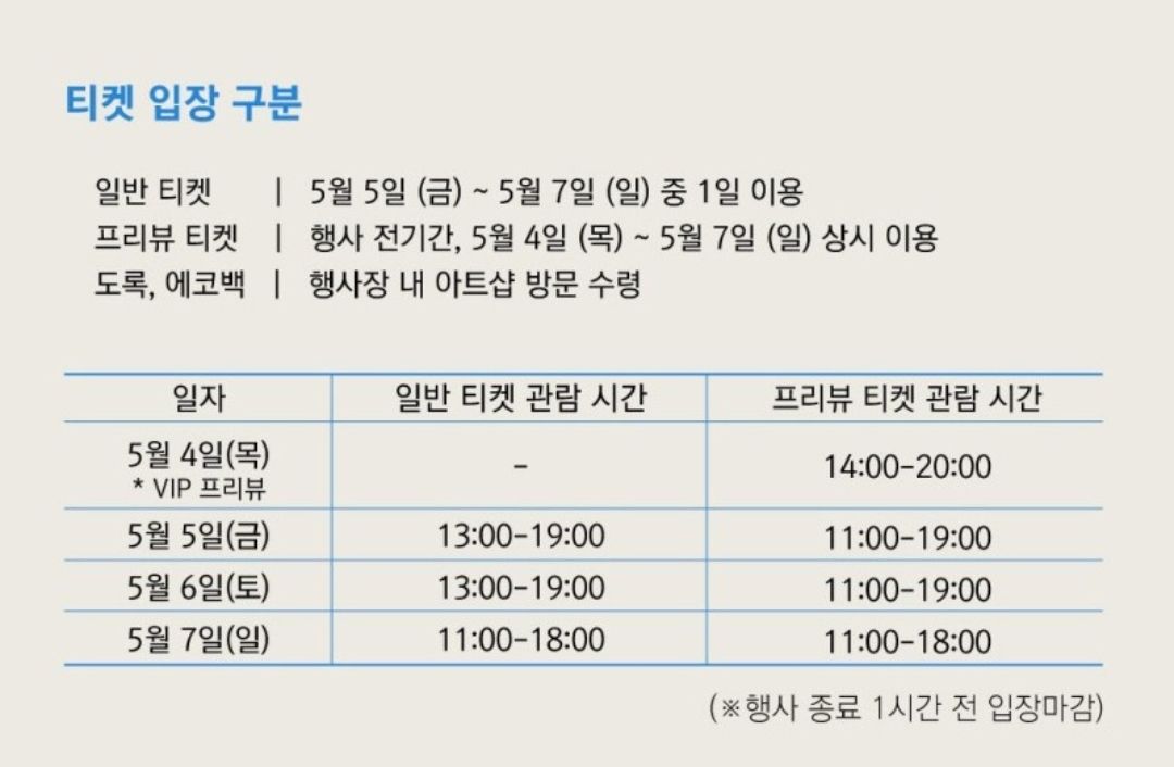 (5/7 일요일은 일반티켓과 프리뷰 티켓 11:00~18:00 동일)