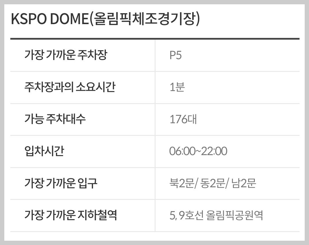 KSPO DOME 올림픽체조경기장에서 가장 가까운 주차장은 P5구역이며 가능 주차대수는 176대이고