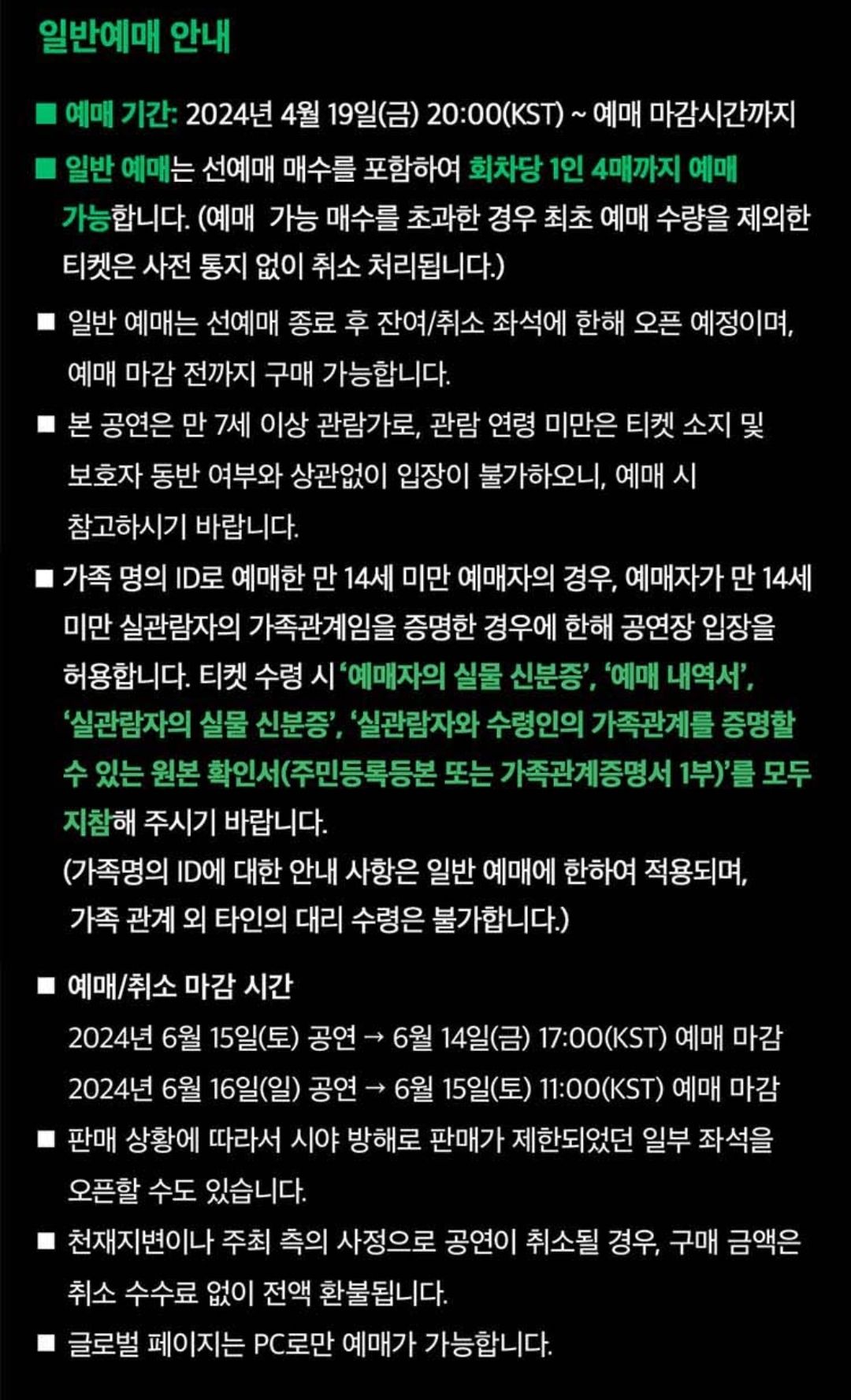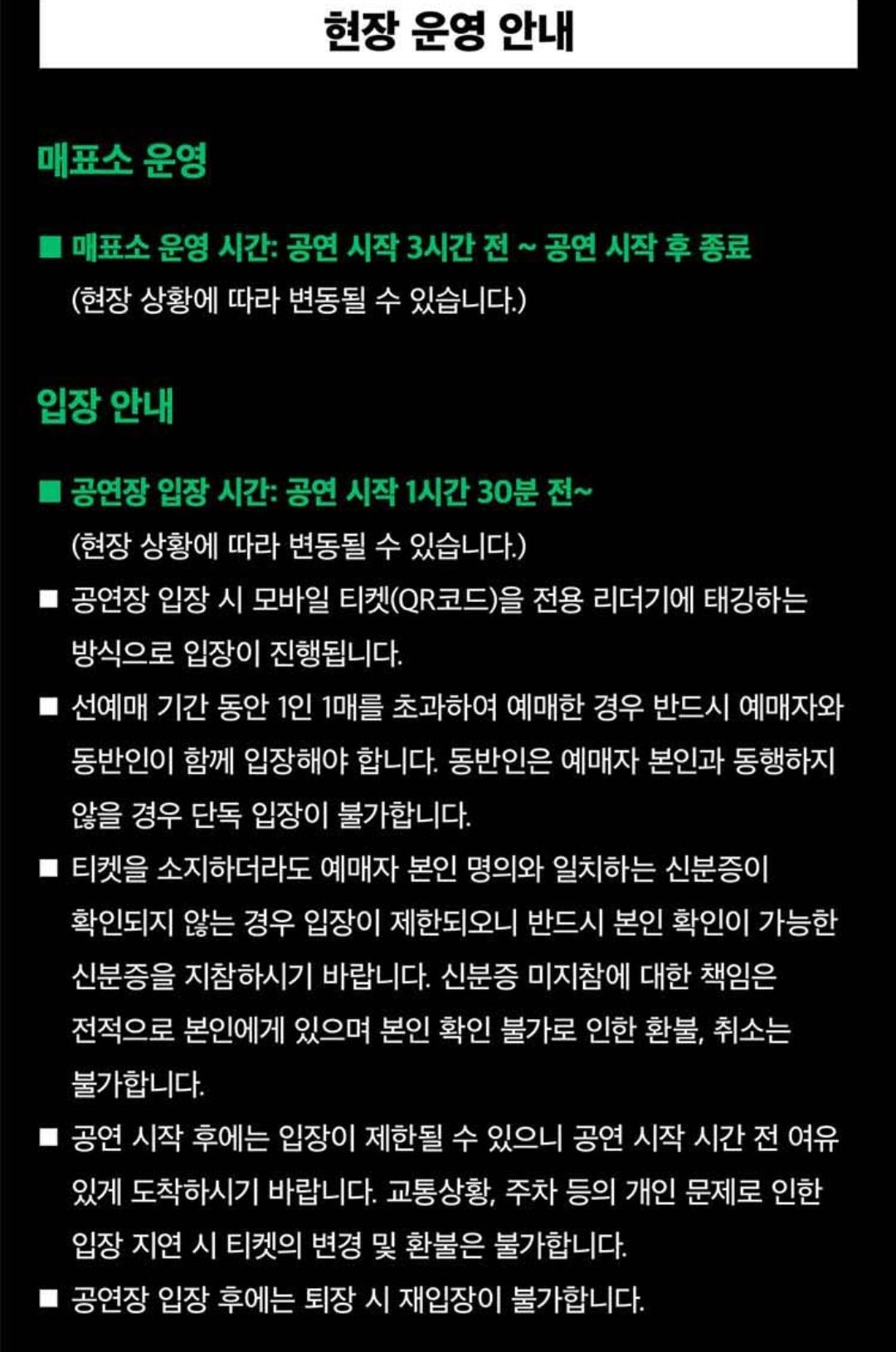 예매자 본인 명의와 일치하는 신분증이 확인되지 않는 경우 입장이 제한되니까 반드시 본인 확인이 가능한 신분증을 지참하시는 것 잊지 마세요.