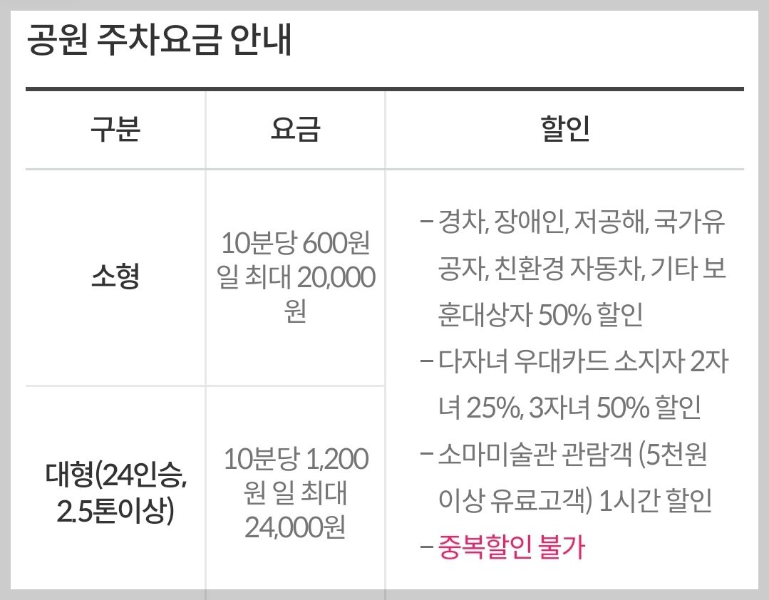 주차요금은 소형 기준(24인승 이하) 10분당 600원, 일 최대 20,000원입니다.