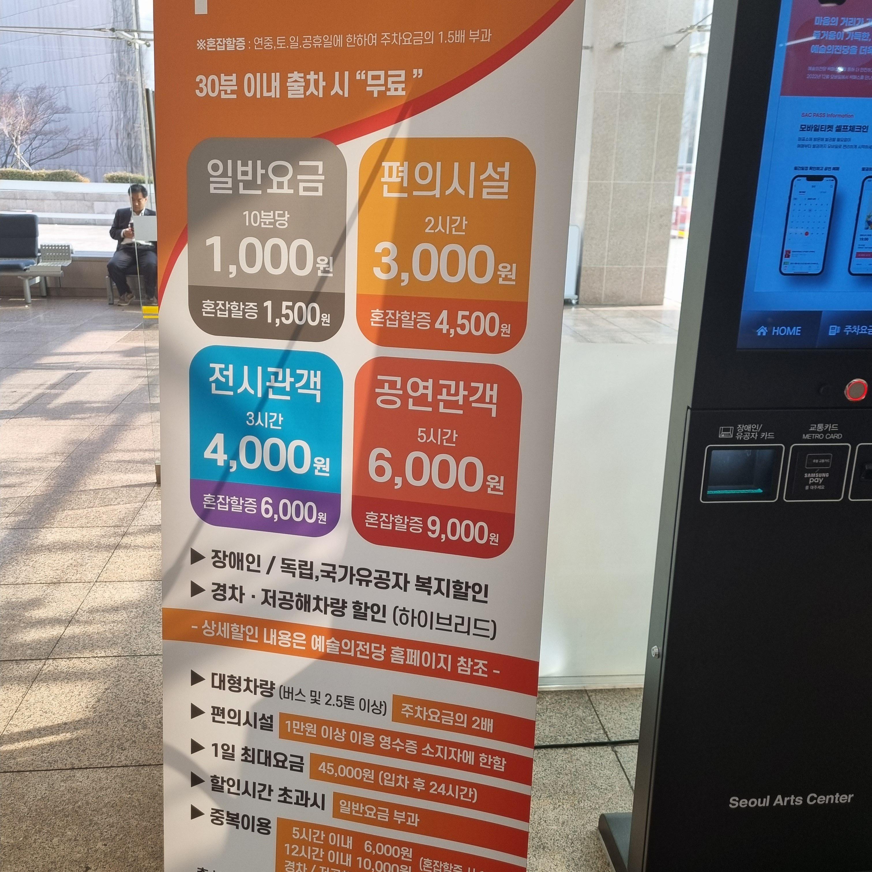 전시관람객은 티켓의 바코드로 주차사전정산기에서 3시간에 4,000원으로 할인을 받을 수 있는데, 주말이나 공휴일엔 혼잡할증으로 6,000원이 부과되니 참고하세요.