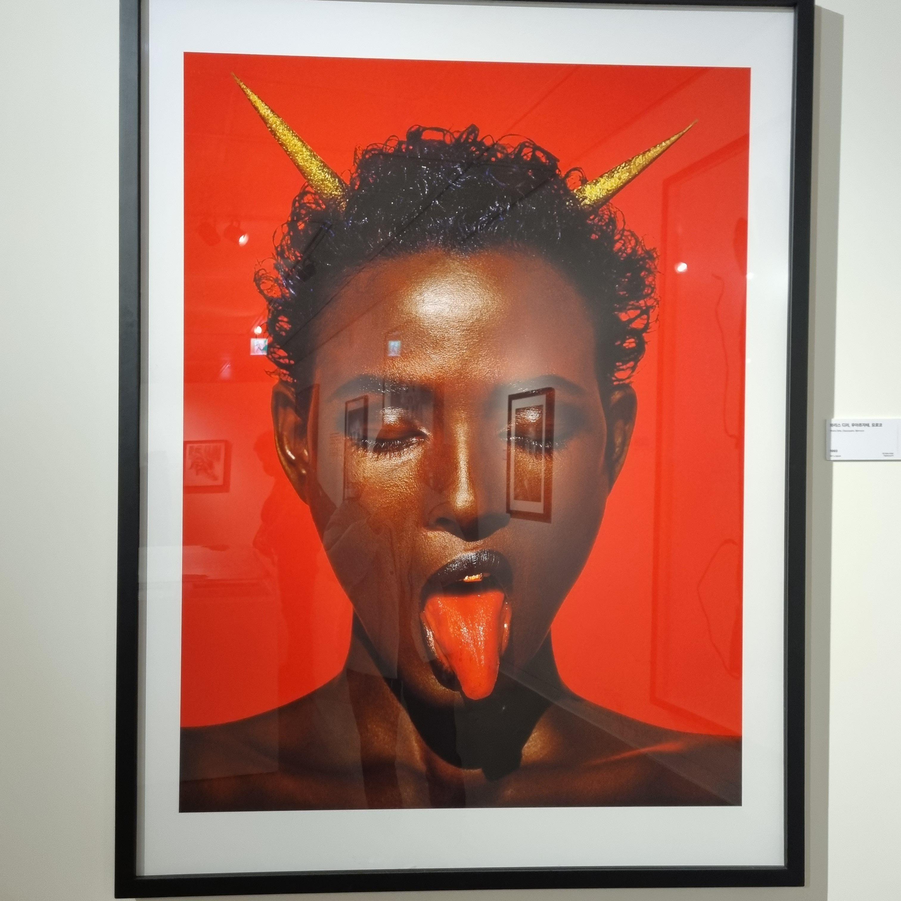 이것은 모델이자 여성 인권운동가인 와리스 디리를 찍은 것인데, 색소를 가미한 식품으로 혀를 붉게 만들고 금색 종이를 말아서 뿔처럼 만들었습니다.