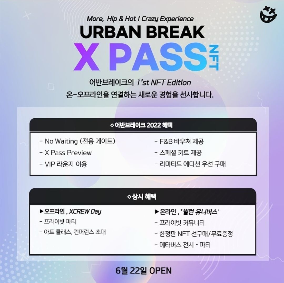 이번 어반브레이크2022는 VIP프리뷰 전에 'X PASS'라고 2022개 한정 발매되는 NFT 멤버쉽을 가진 분들은 한시간 일찍 입장할수 있고 그외에 다양한 혜택을 누릴수 있습니다. 사실 VIP보다 한시간 더 일찍 입장할 수 있는게 가장 큰 혜택이겠죠~