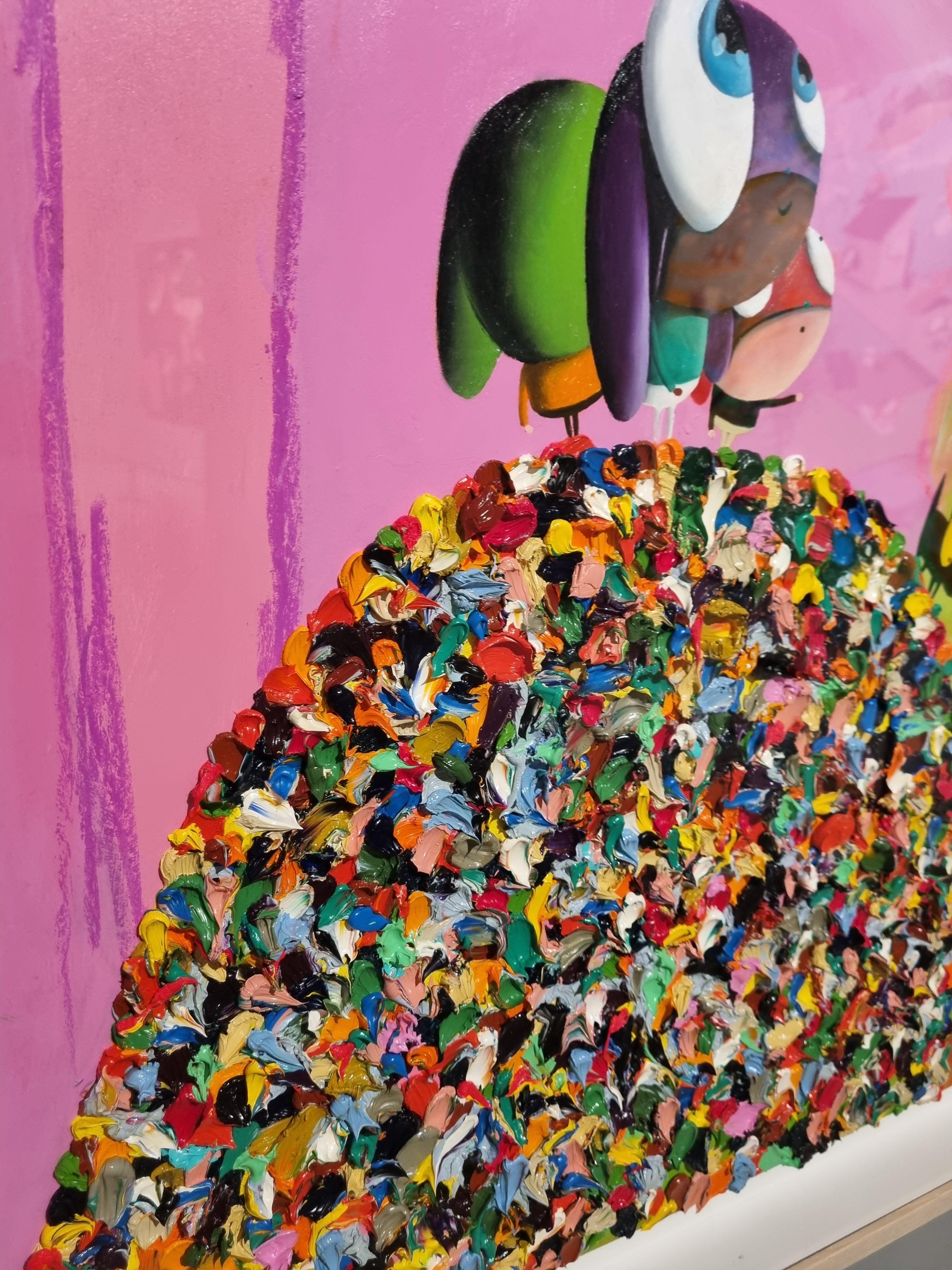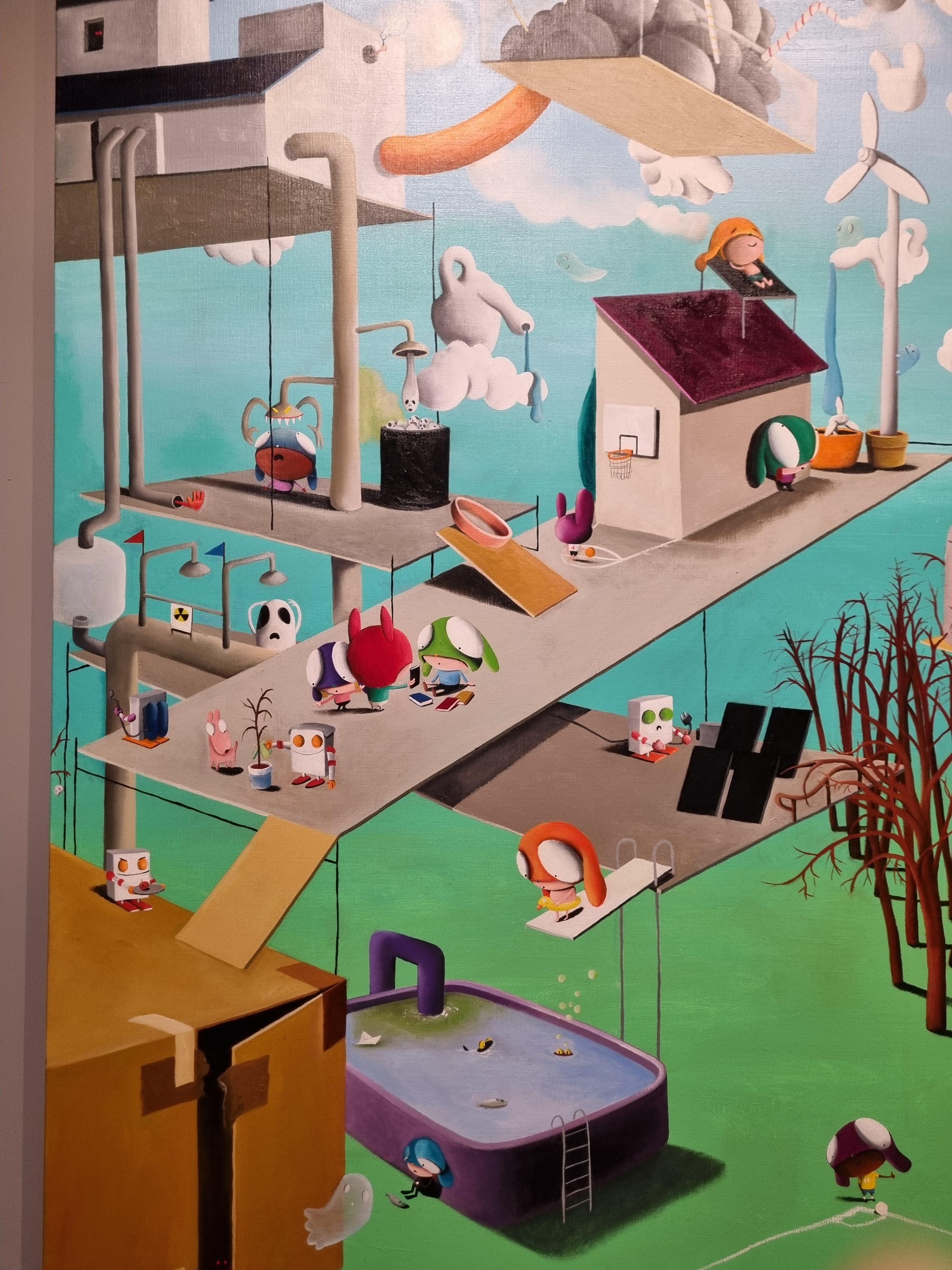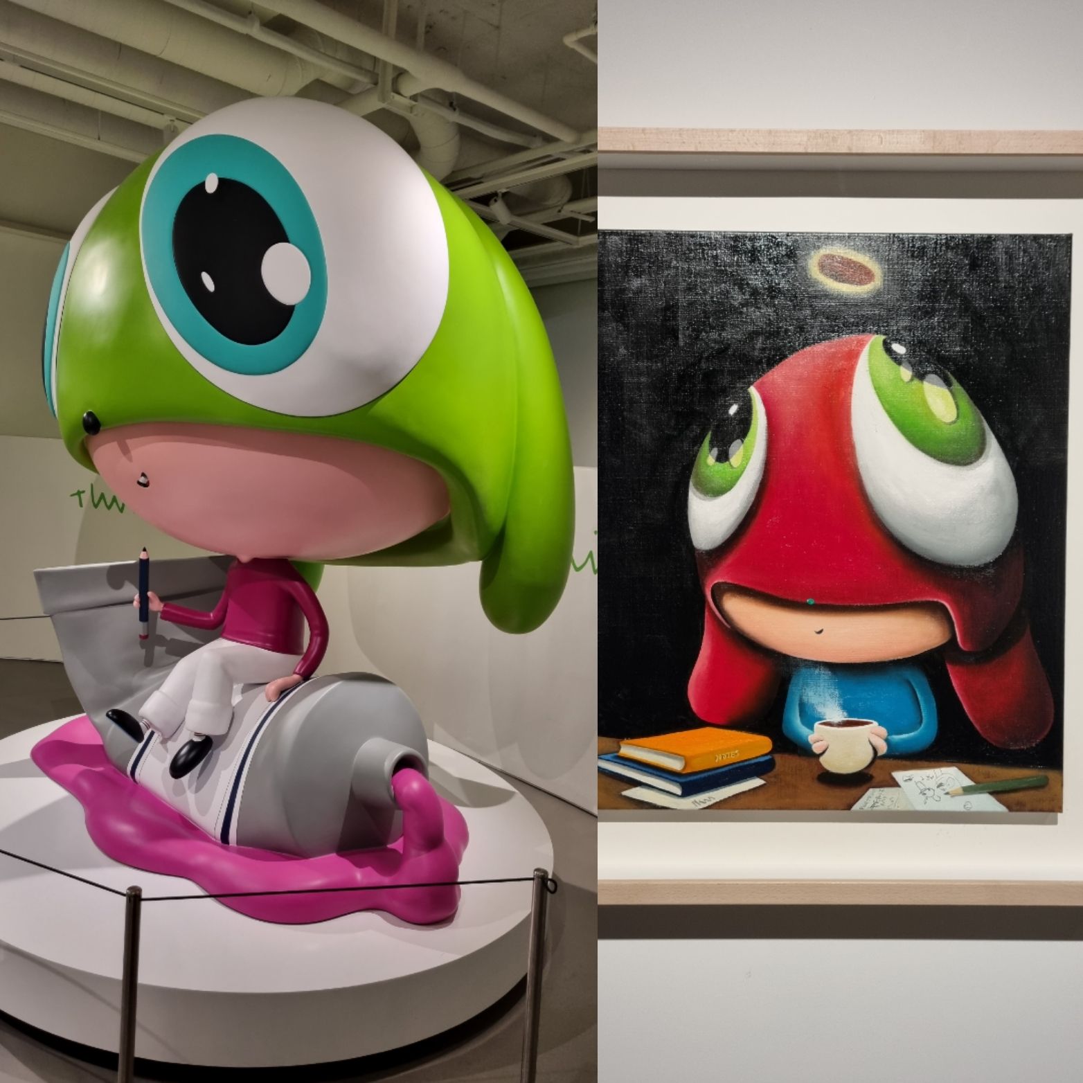 귀여운 캐릭터를 통해 관람객에게 친근하게 다가가면서도 전쟁, 기후 변화, 아동 학대, 인종 차별 등 깊은 주제 의식을 작품에 담고 있어서 작품을 꼼꼼히 보다보면 곳곳에 그런 상징적인 것들이 숨어있어요.