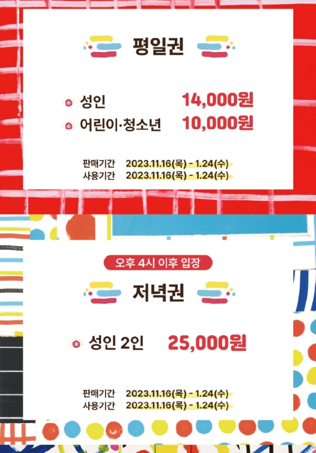 티켓 : 성인 20,000원/ 어린이, 청소년 15,000원/ 만65세 이상 10,000원