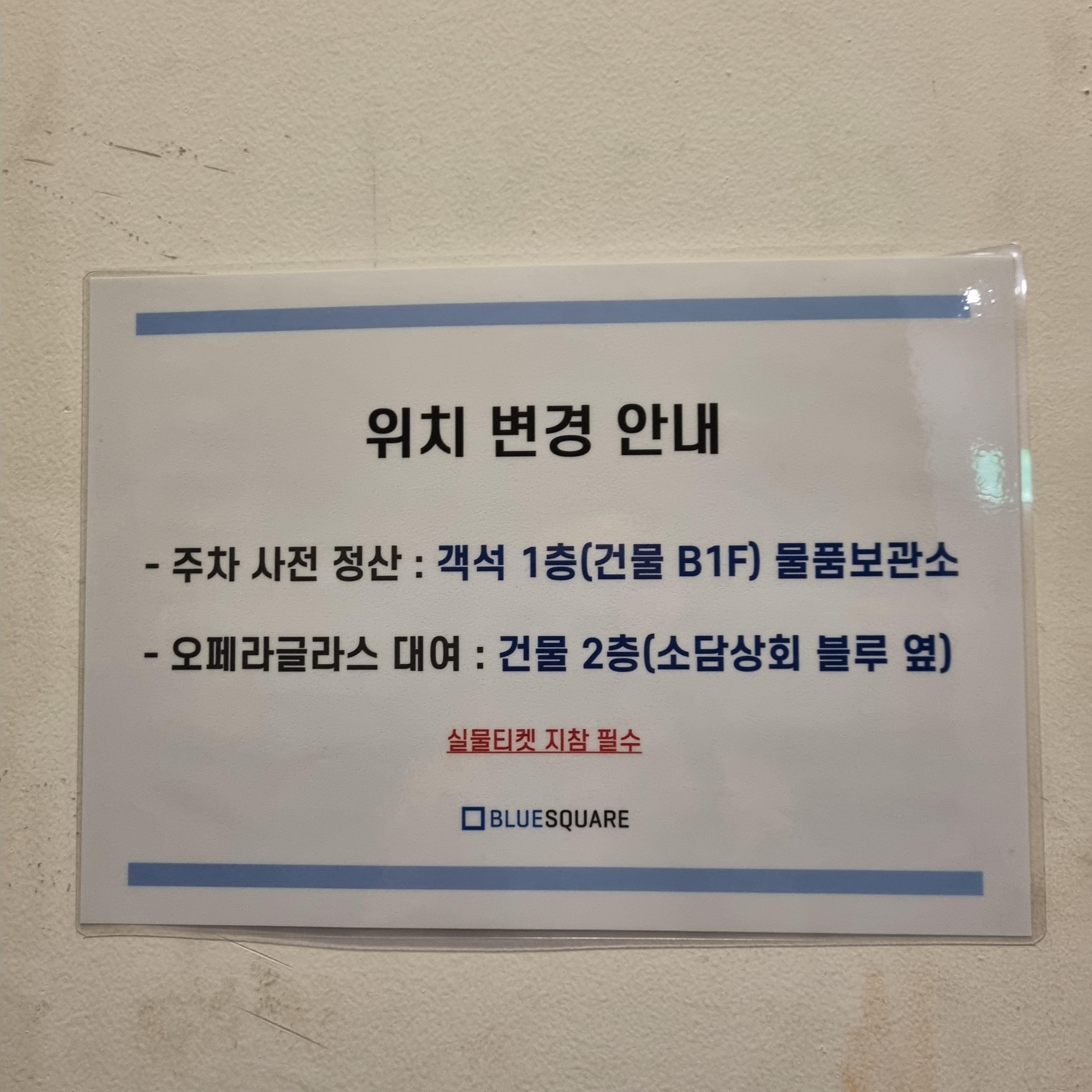 블루스퀘어 신한카드홀의 주차는 4시간에 5천원이라 그리 비싸지 않지만, 공연 시작전 한시간전에 도착을 하지 않으면 주차자리가 없을 수도 있습니다.