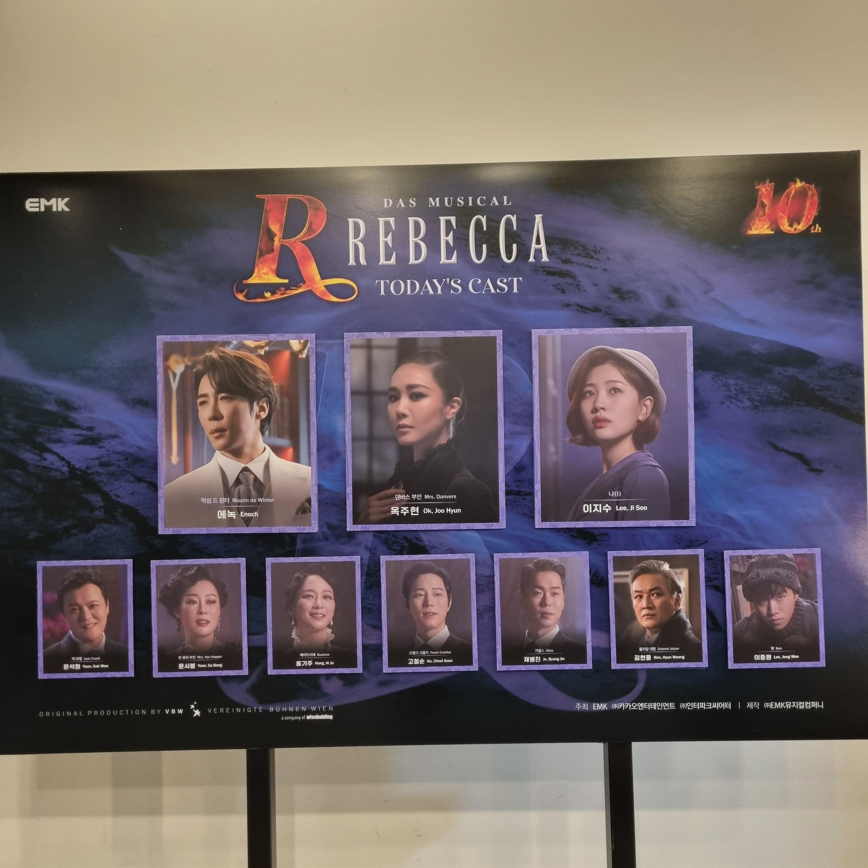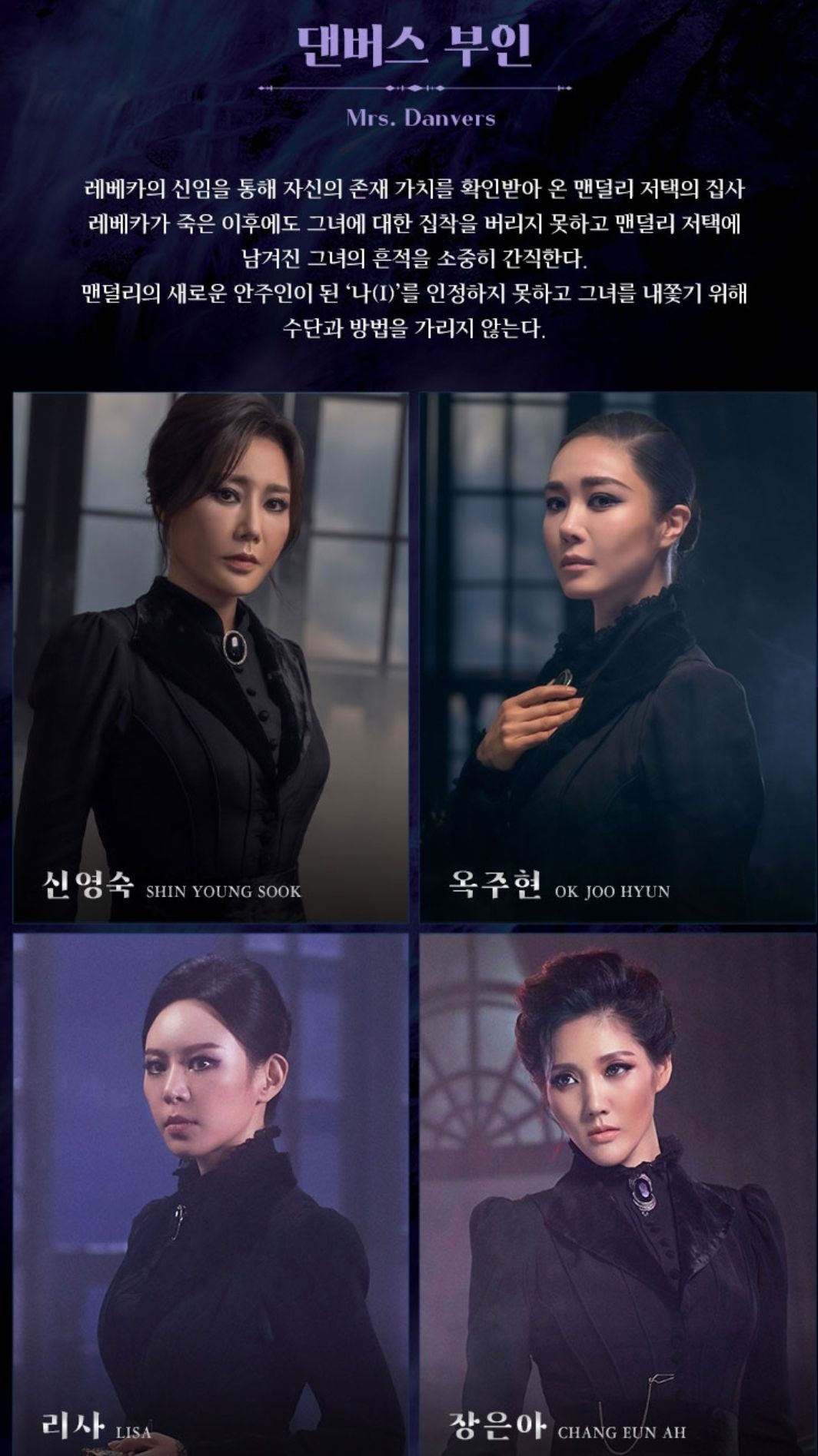 '막심 드 윈터' 역에 류정한, 민영기, 에녹, 테이가 '댄버스부인'역에 신영숙, 옥주현, 리사, 장은아가 '나' 역에 김보경, 이지혜, 이지수, 웬디가 열연합니다.