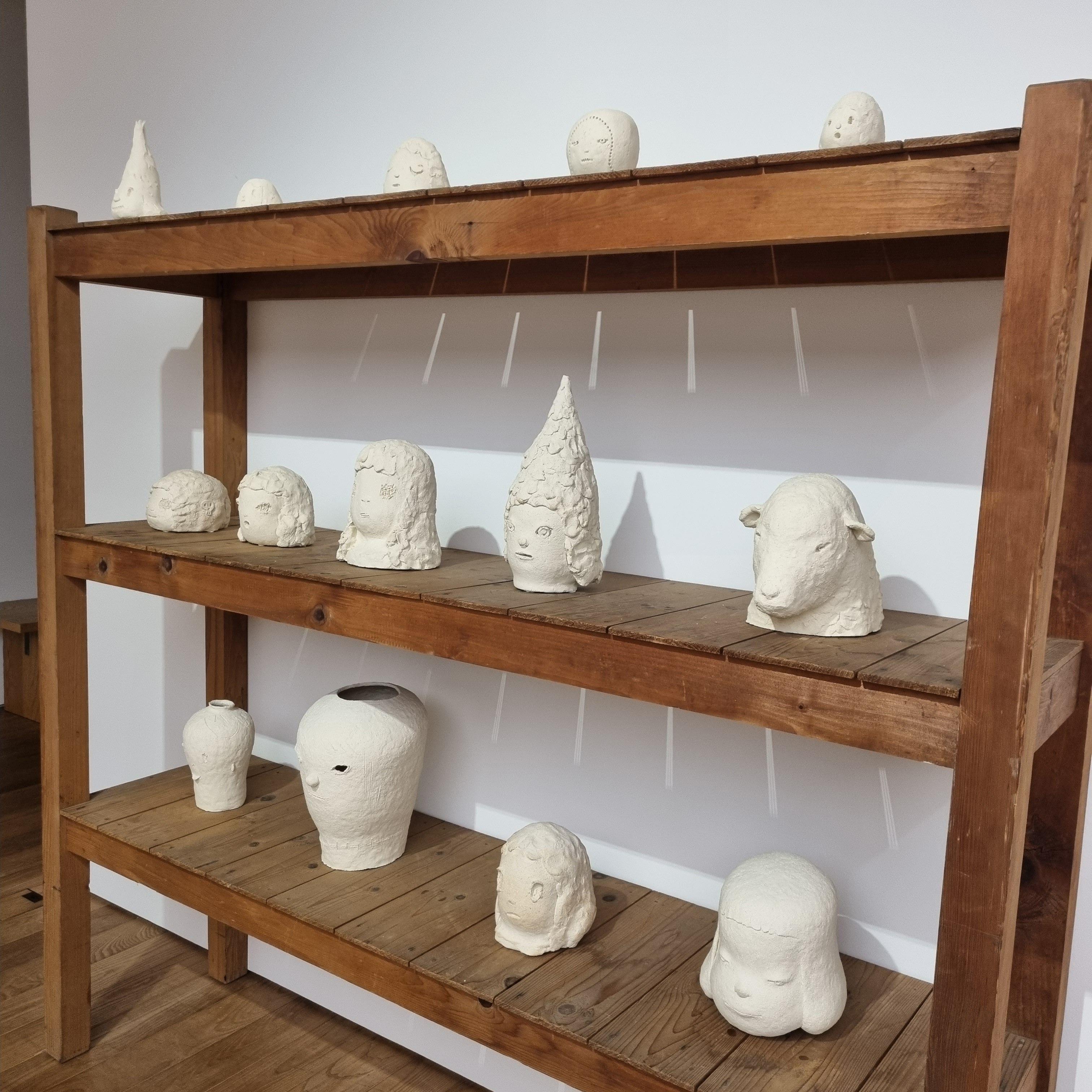 눈을 뜨거나 감은 도자기 작품들.