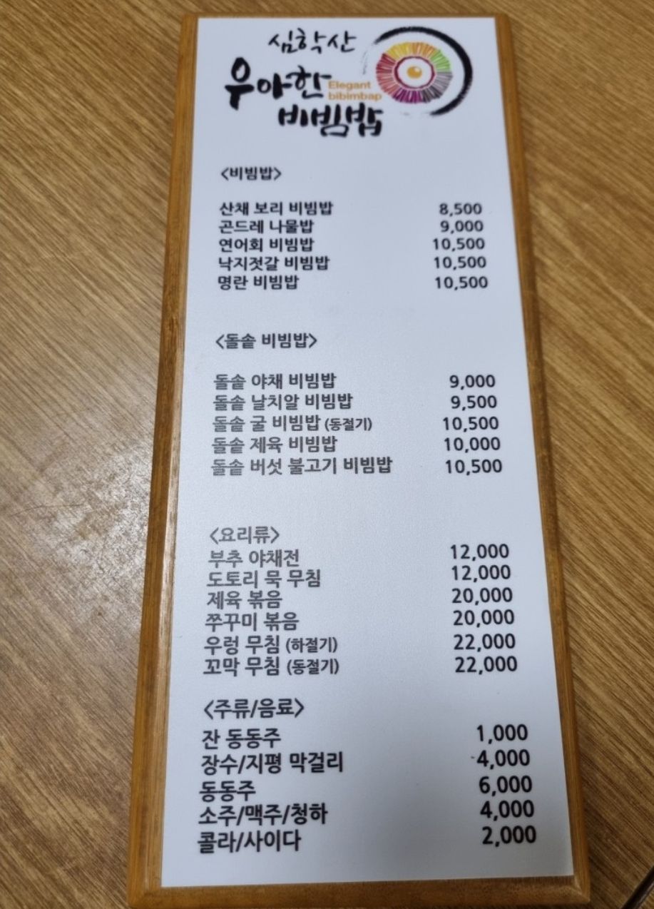 메뉴는 비빔밥과 돌솥비빔밥, 전, 무침, 볶음 종류 등 다양했습니다.