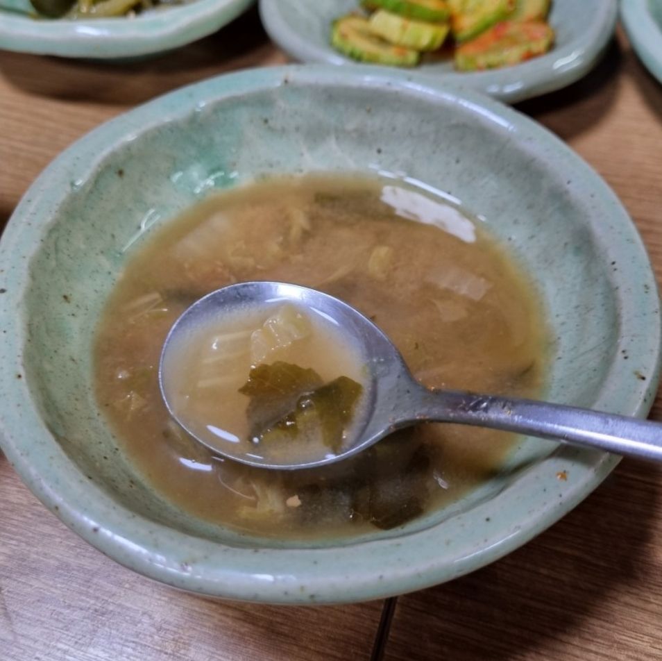 비빔밥에 곁들여주는 국들은 그냥 멸치육수나, 콩나물 3가닥쯤 들어있는 콩나물국이거나, 미소국이거나 그런 경우가 많은데, 오래 끓여서 깊은 맛이 나는 시래기된장국이라니 참 반가웠습니다.