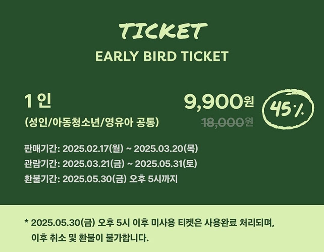 티켓 ㅣ성인 18,000 ㅡ> 9,900원 얼리버드 판매(3/20일까지)