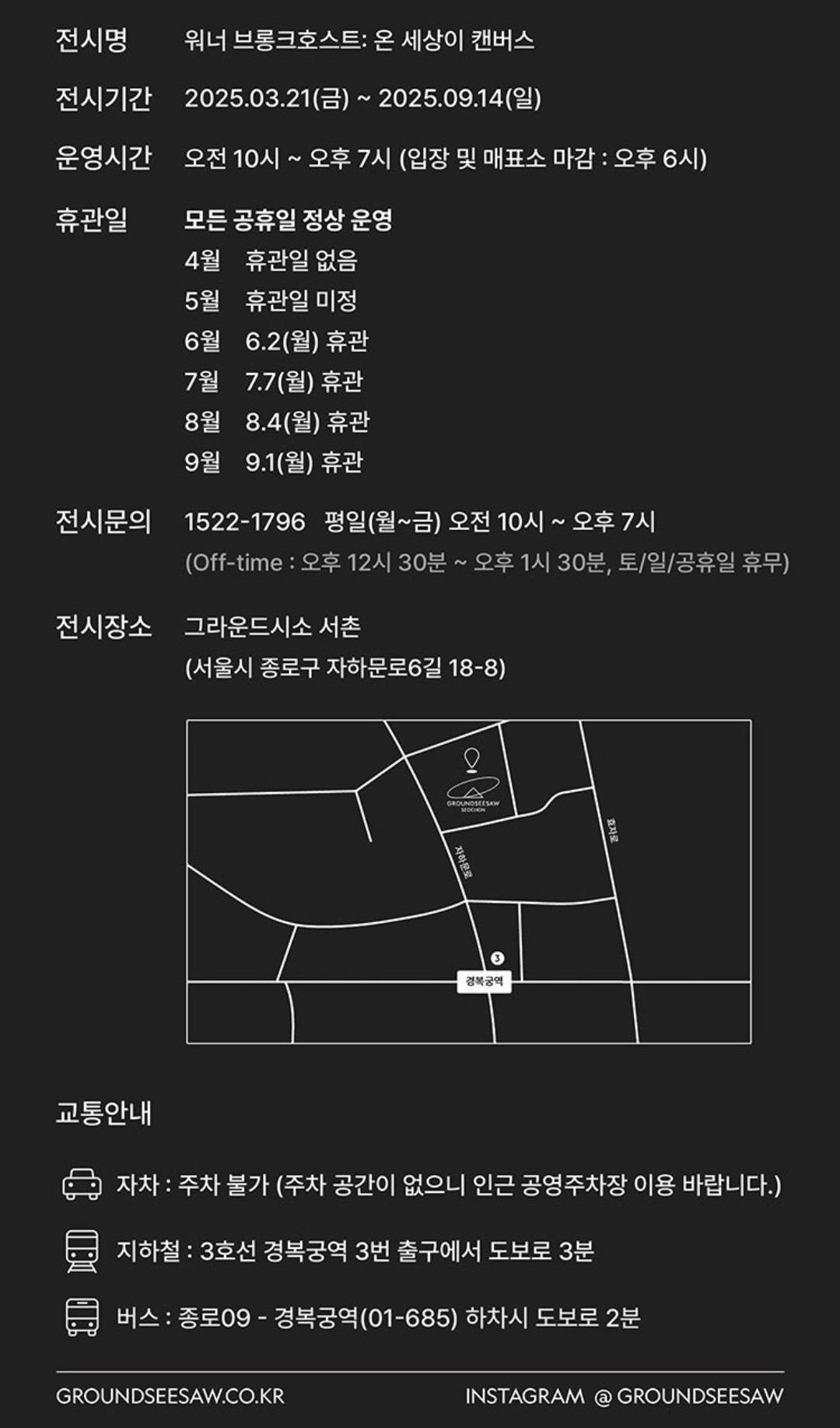 전시가 열리는 그라운드시소 서촌은 경복궁역 3번 출구와 인접해있으며 전시장에 주차장은 별도로 없습니다.
