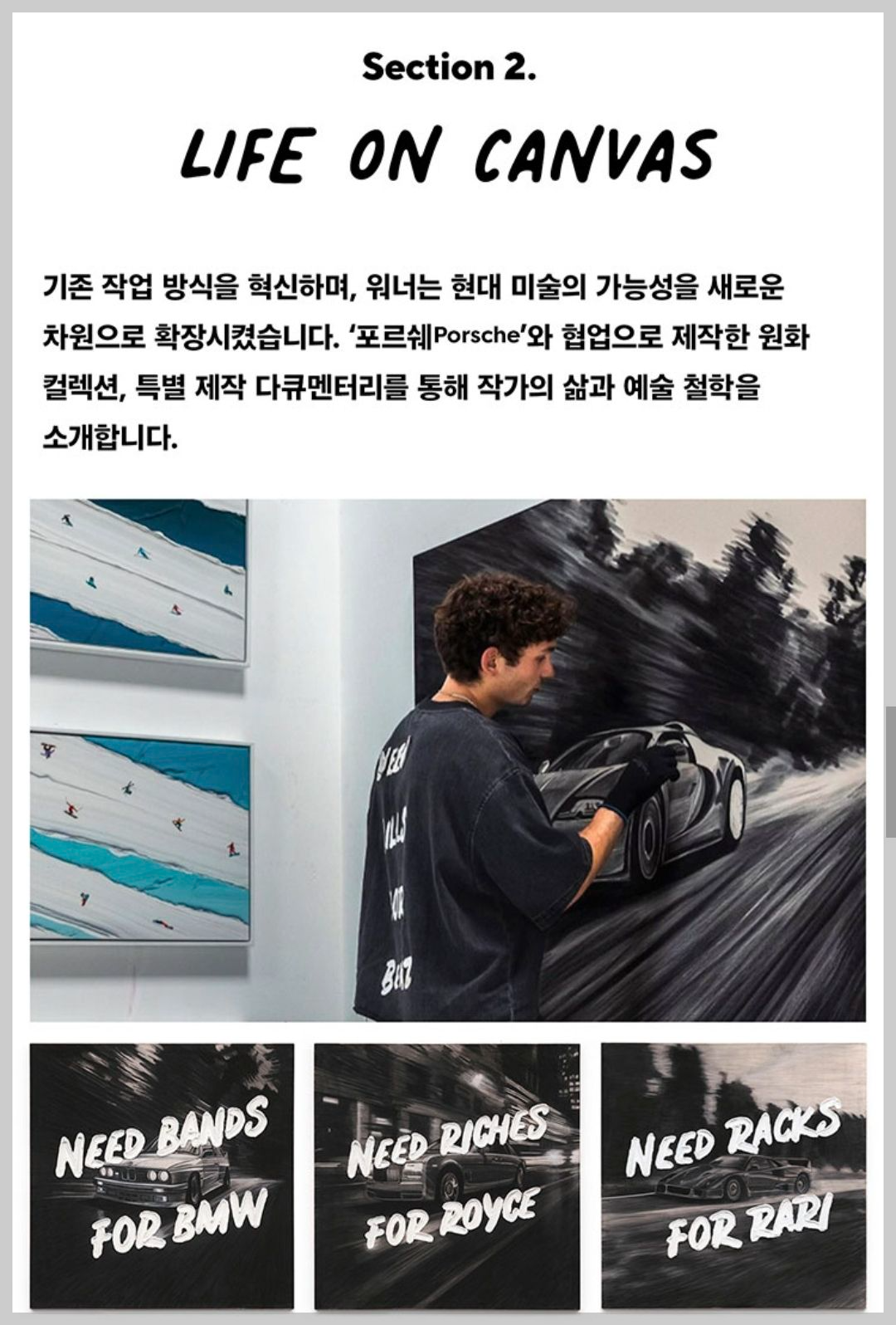두번째 섹션에서는 포르쉐와의 협업으로 제작한 원화컬렉션, 특별 제작 다큐멘터리를 통해 작가의 삶과 예술 철학을 소개합니다.
