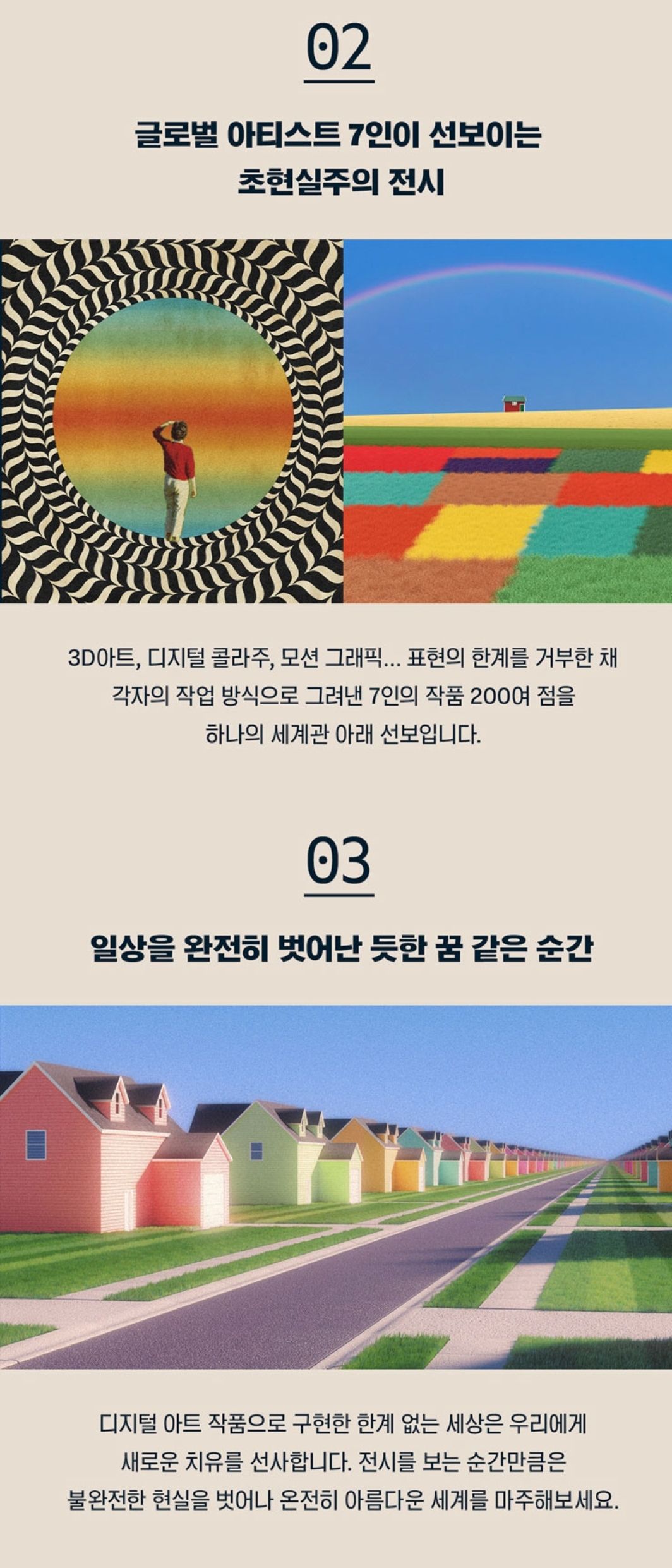 그리고 3D아트, 디지털 꼴라주, 모션 그래픽 등 표현의 한계를 거부하고 각자의 방식으로 그려낸 7인의 작품 200여 점을 하나의 세계관 아래서 선보인다고 해요.