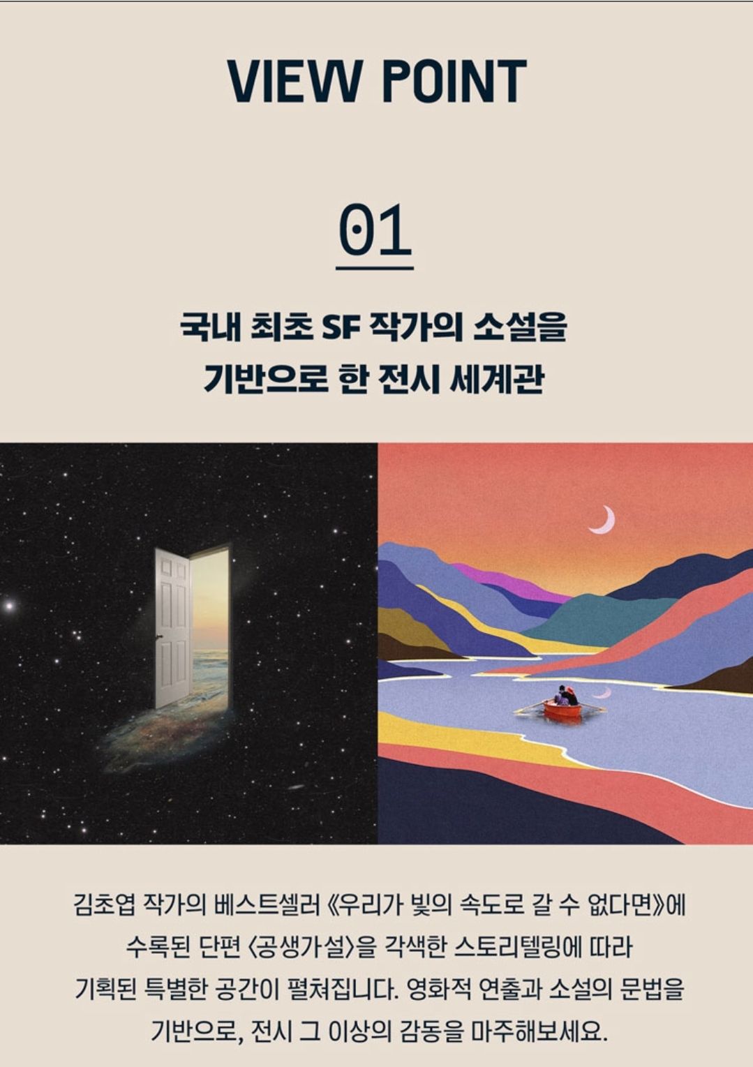 김초엽작가의 베스트셀러 <우리가 빛의 속도로 갈 수 없다면>에 수록된 단편 '공생가설'을 각색한 스토리텔링에 따라 기획된 특별한 공간이 펼쳐지고
