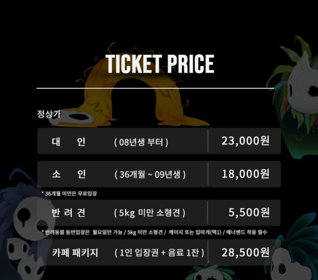 티켓 ㅣ대인 23,000원/ 소인 18,000원/ 반려견 5,500원(월요일만)