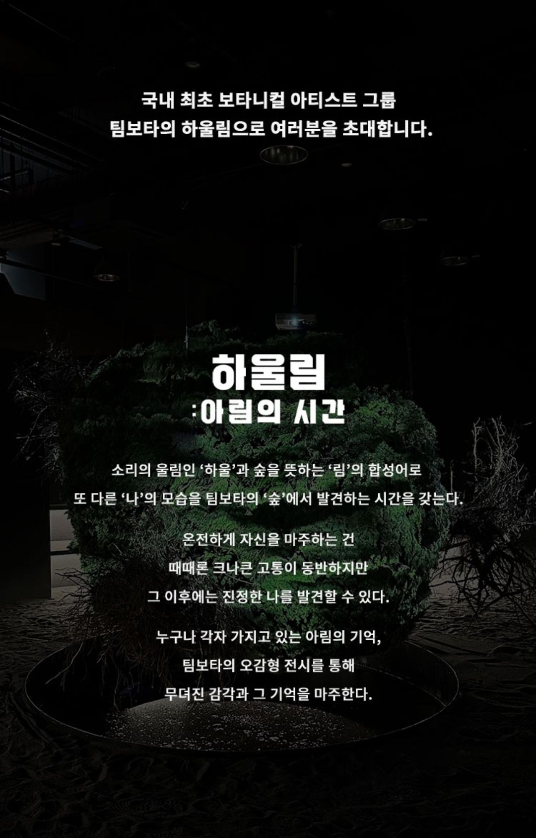 <하울림 : 아림의 시간>전시는 실내 약 1000여 평의 규모로 자연(식물, 꽃, 돌, 안개, 빛 등)에 다양한 아트기법(조각미술, 설치미술, 조명예술, 뉴미디어 등)을 접목하여 그 아름다움을 현대적 감각으로 재해석, 재구성했습니다.