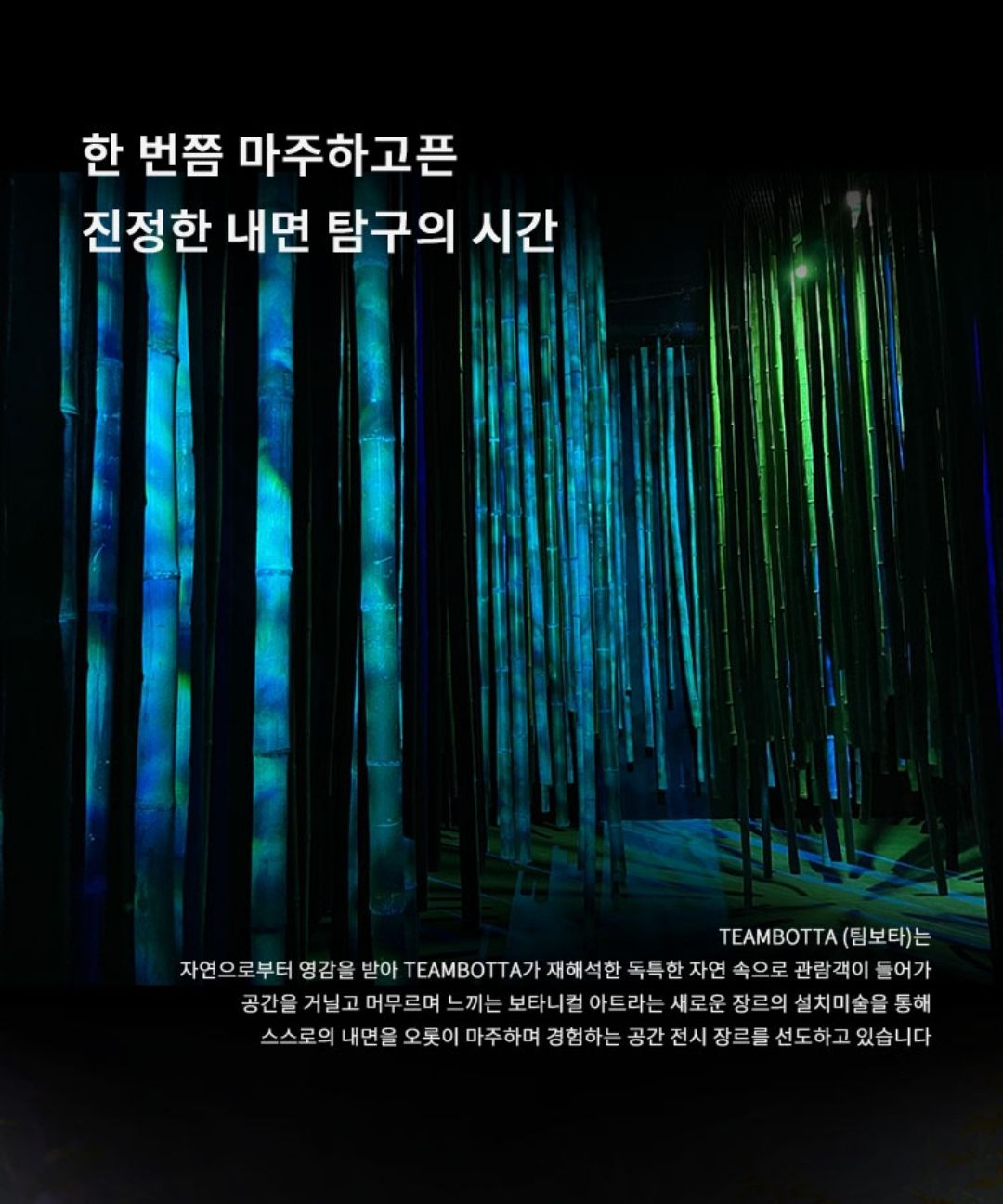 이번 전시는 자연으로부터 영감을 받아 팀보타가 재해석한 독특한 자연속으로 관람객이 들어가 공간을 거닐고 머무르며 느끼는