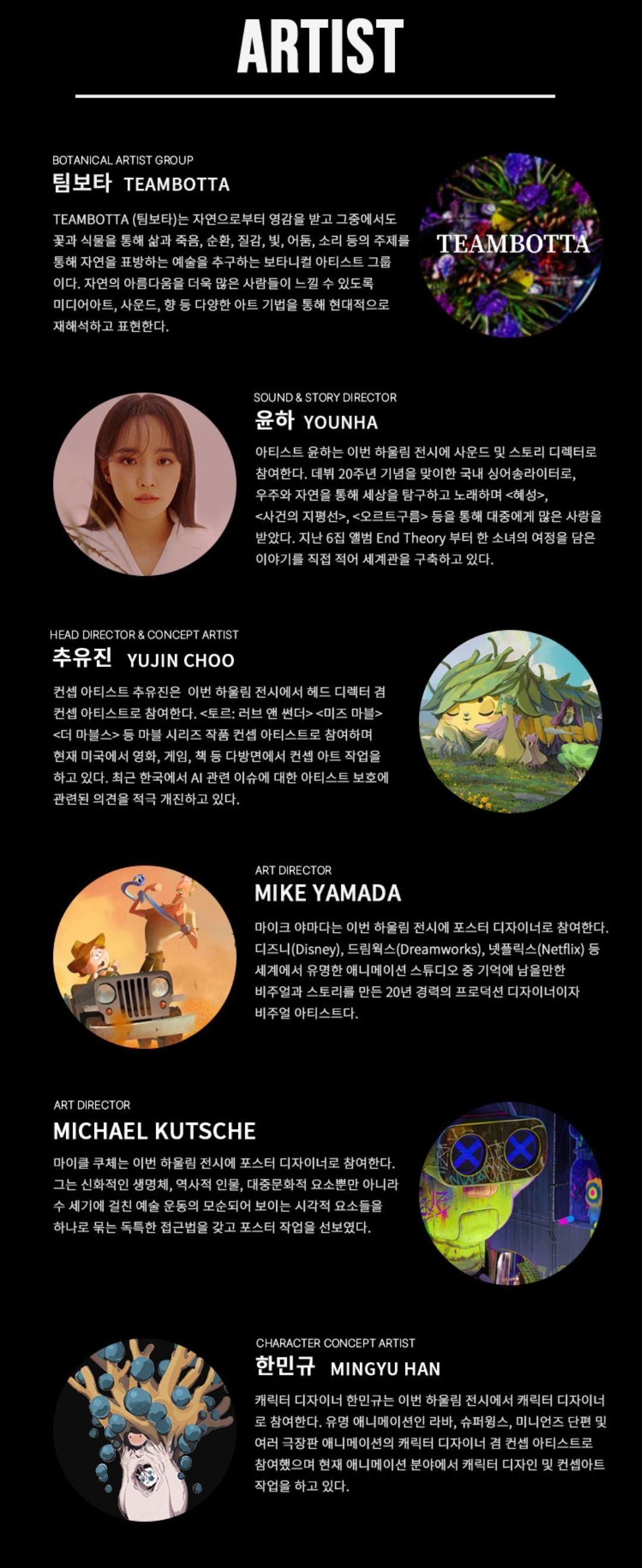 팀보타는 꽃과 식물로부터 영감을 받아 삶과 죽음, 빛과 어둠, 소음과 고요 등 '순환'을 주제로 자연을 표방하는 보타니컬 아티스트 그룹입니다.