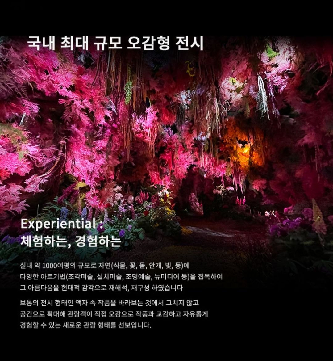 보통의 전시 형태인 액자속 작품을 바라보는 것에서 그치지 않고 공간으로 확대해 관람객이 직접 오감으로 작품과 교감하고 자유롭게 경험할 수 있는 새로운 관람 형태를 선보입니다.