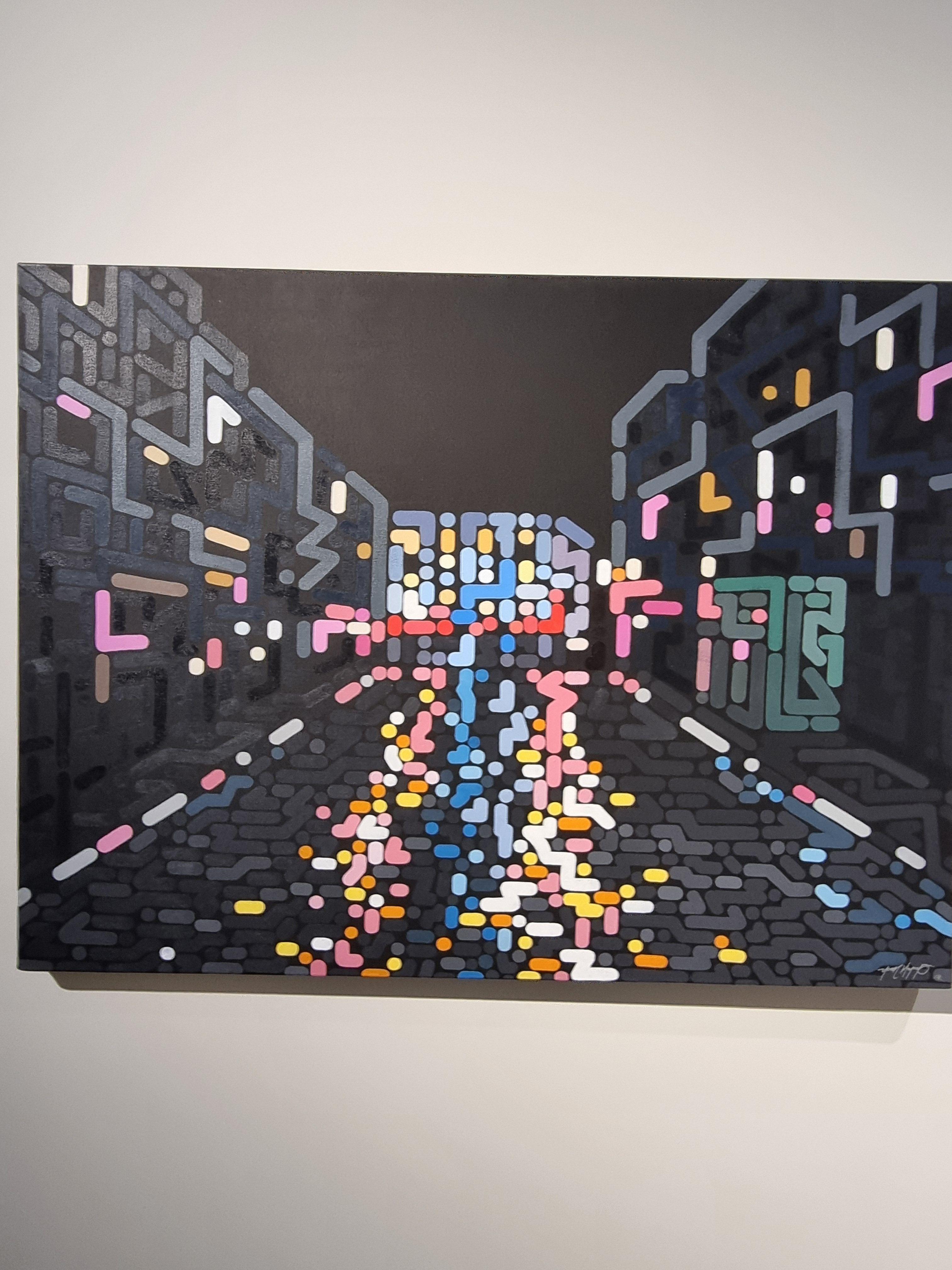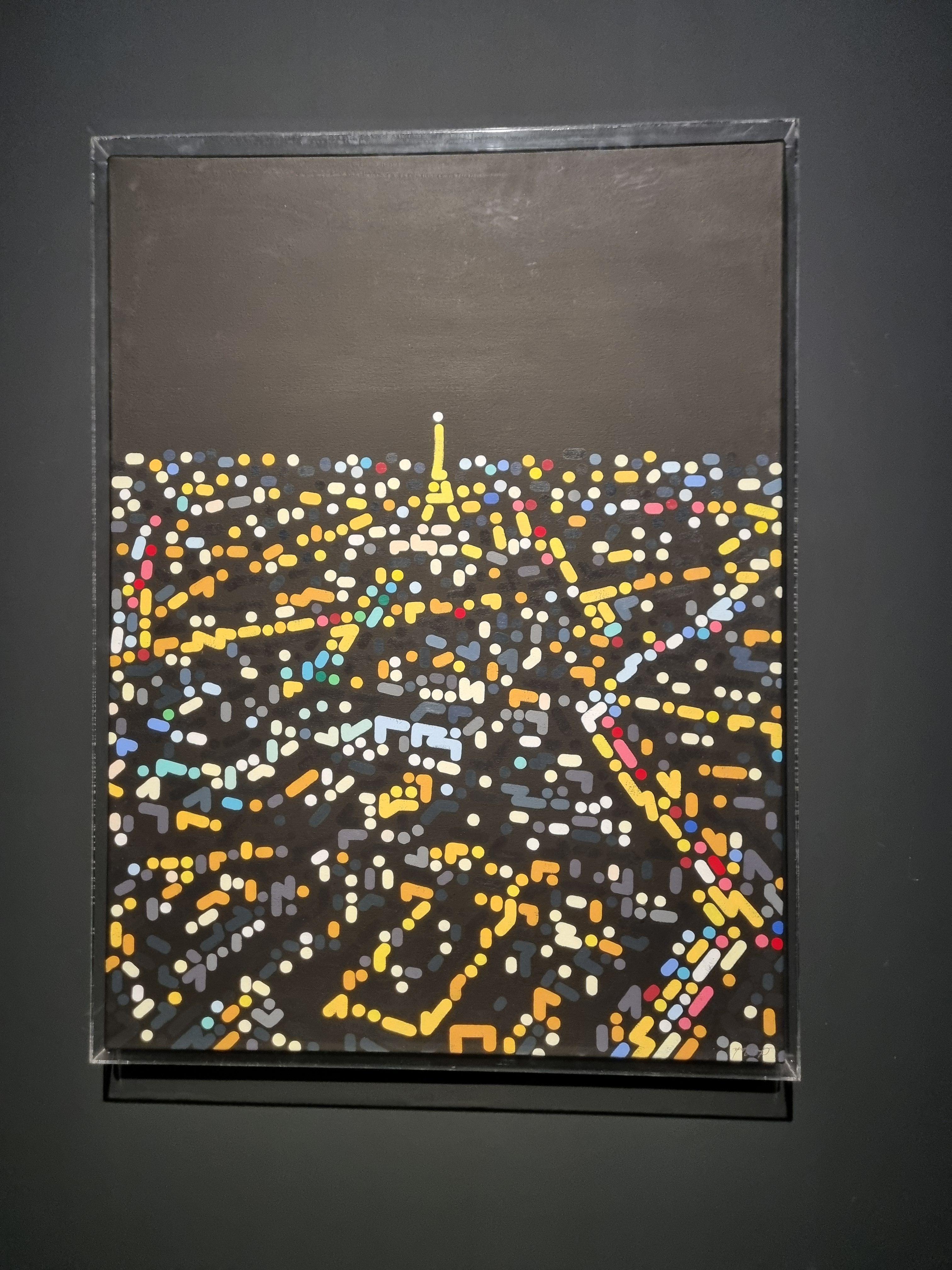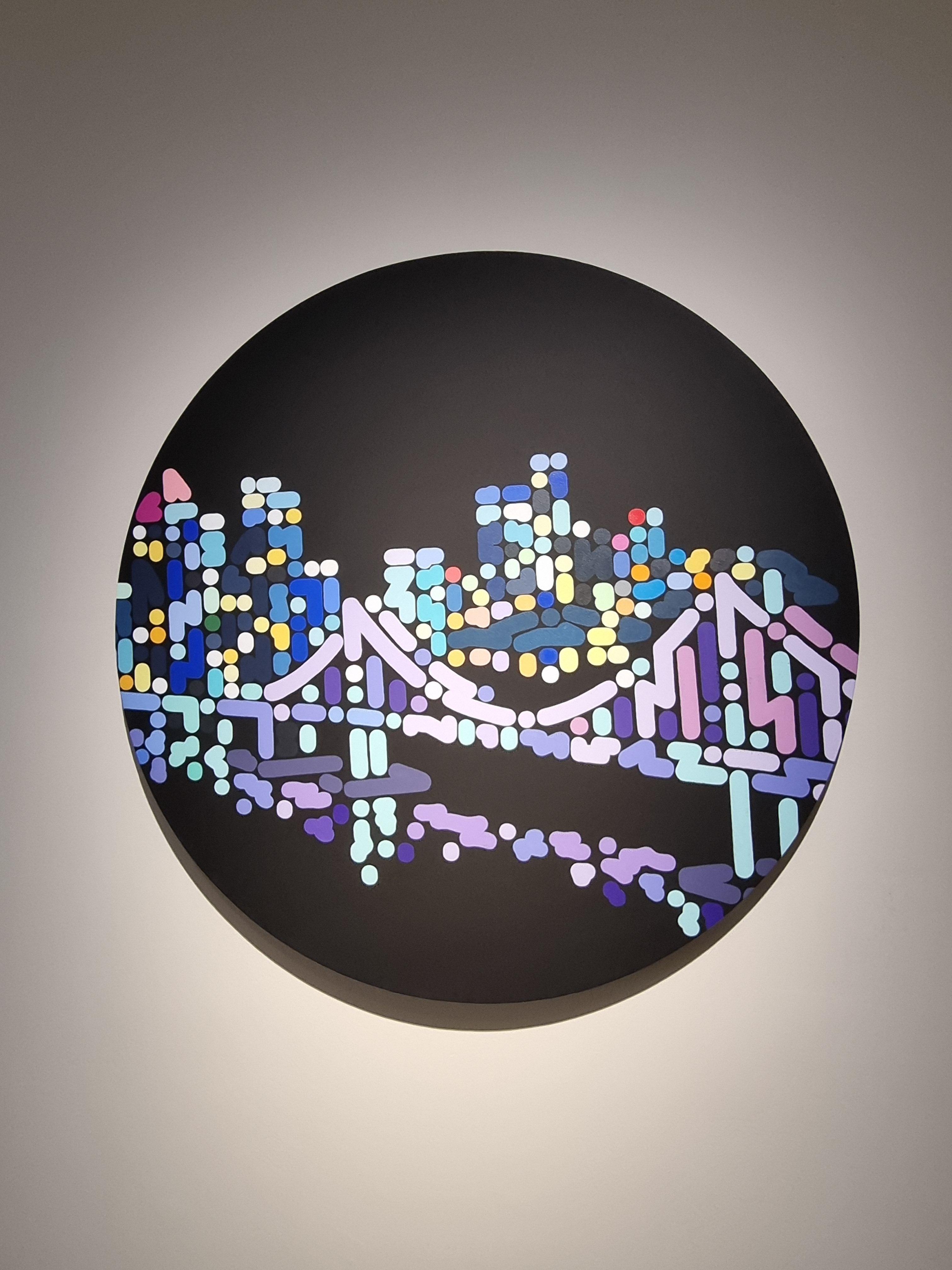 비오는 날 밤 도시의 야경을 표현한 작품인데, 도로 바닥에 물이 고여 비치는 것을 미러볼처럼 보였다고 작가는 말하고 있네요.