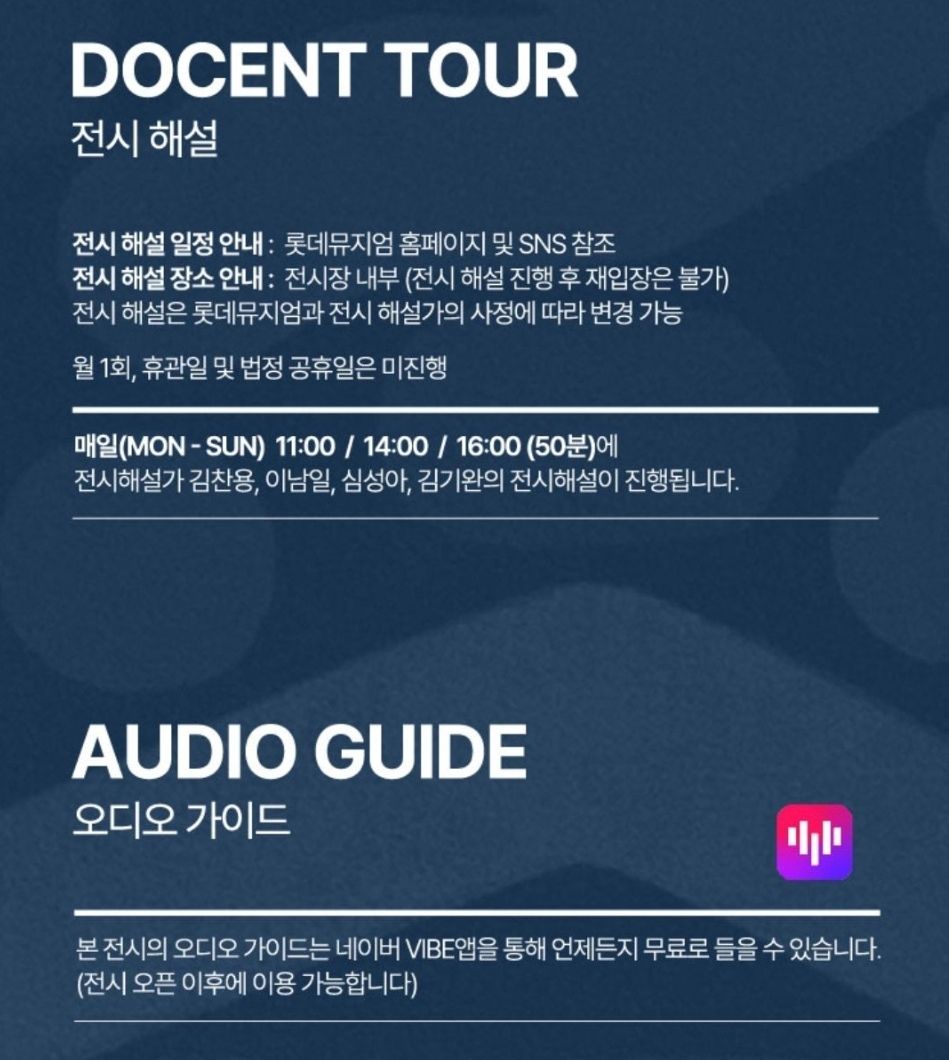 오디오 가이드는 네이버 VIBE 앱을 통해 무료로 언제든지 청취할 수 있습니다.