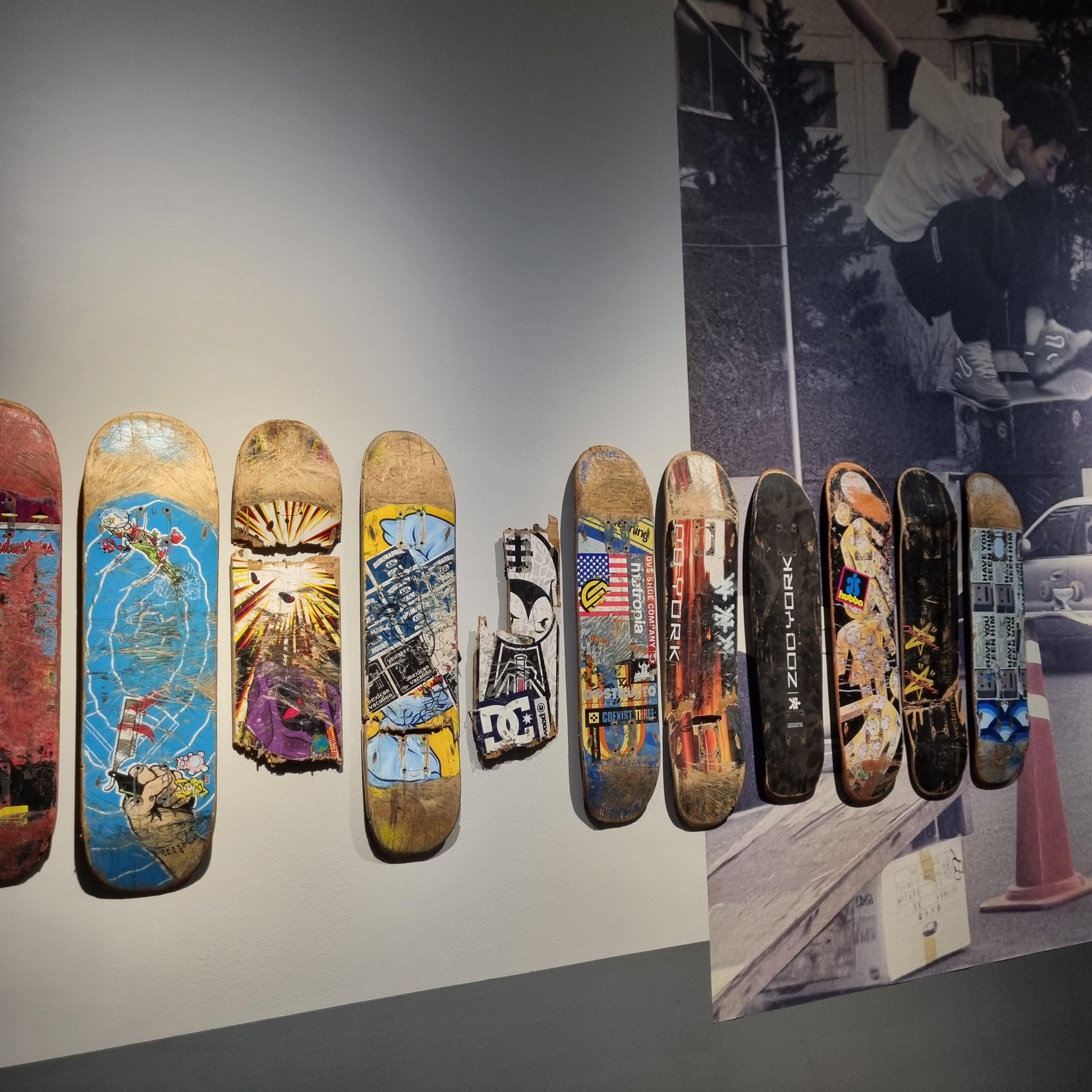 스케이트보드 매니아였던 작가의 스케이트 보드들.