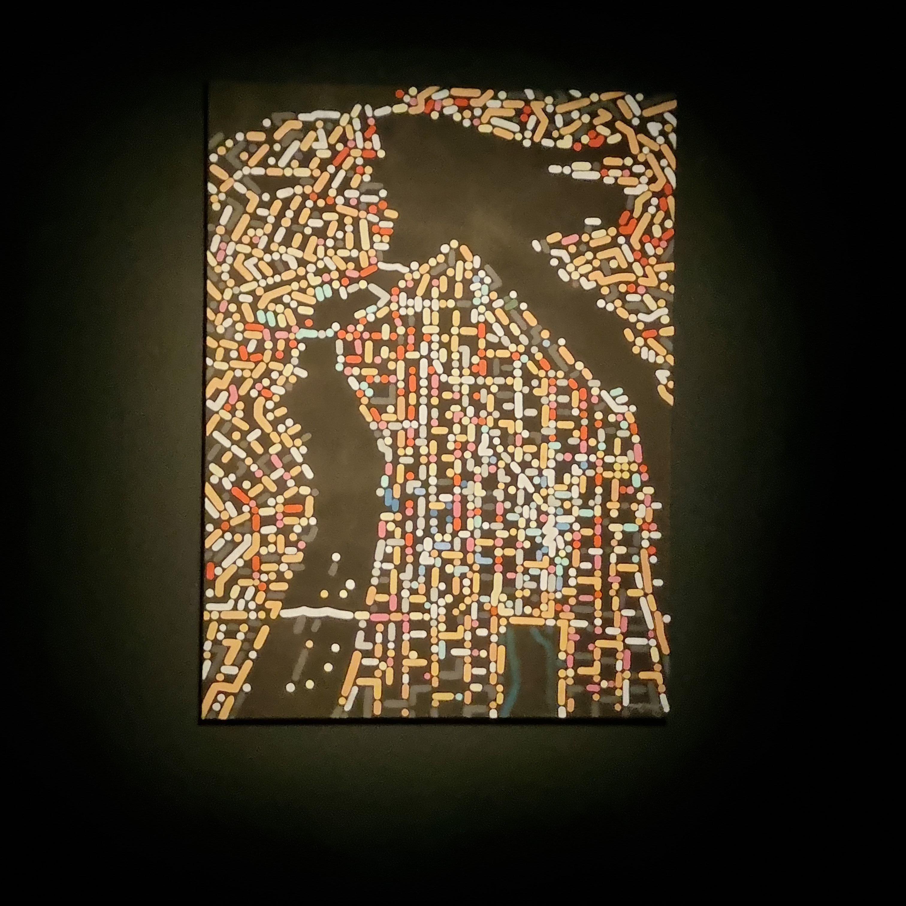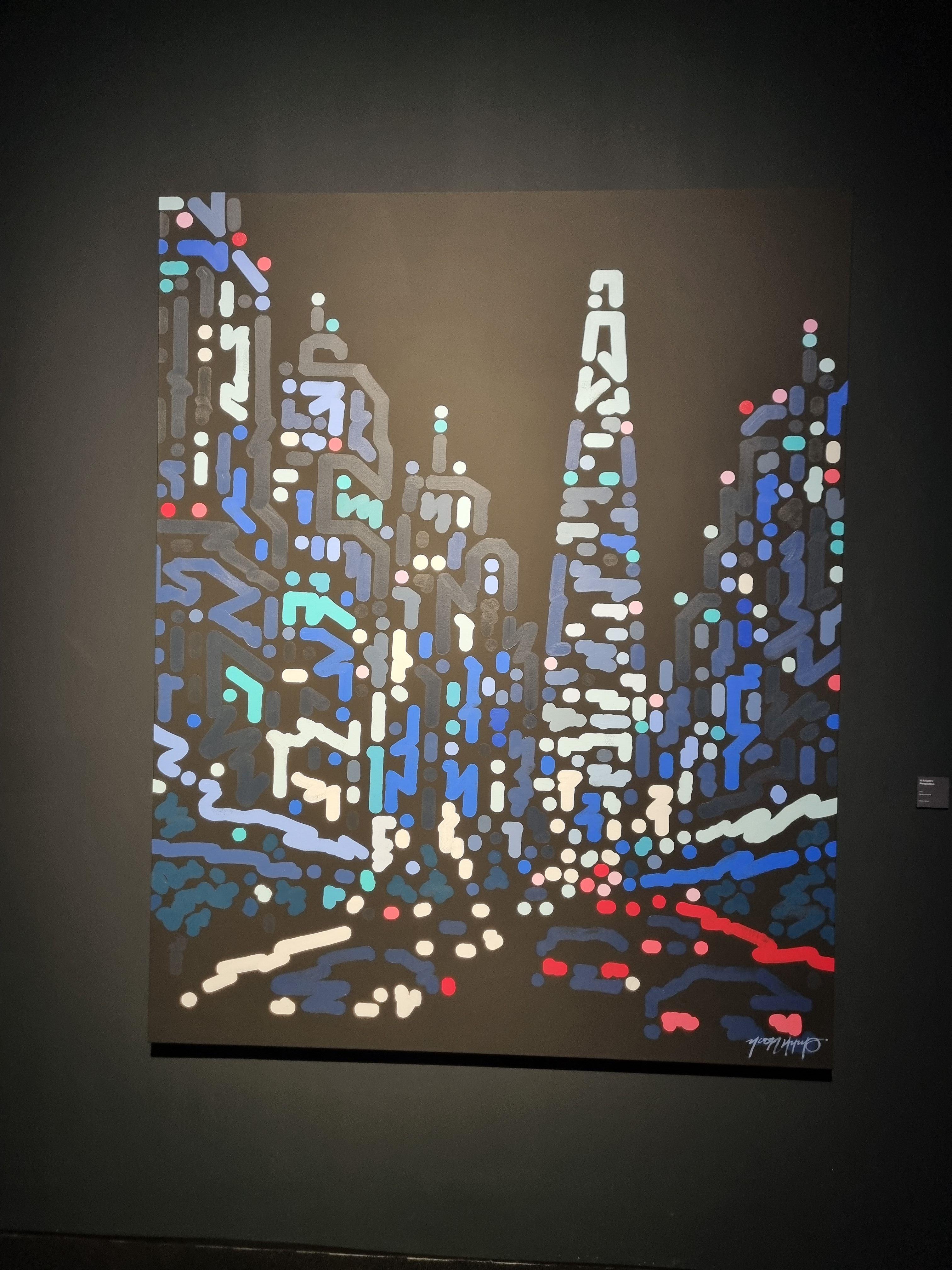 윤협의 주요 작품중 하나인 비행기 창문으로 바라본 화려한 뉴욕 야경의 불빛을 그린 작품이 보입니다.