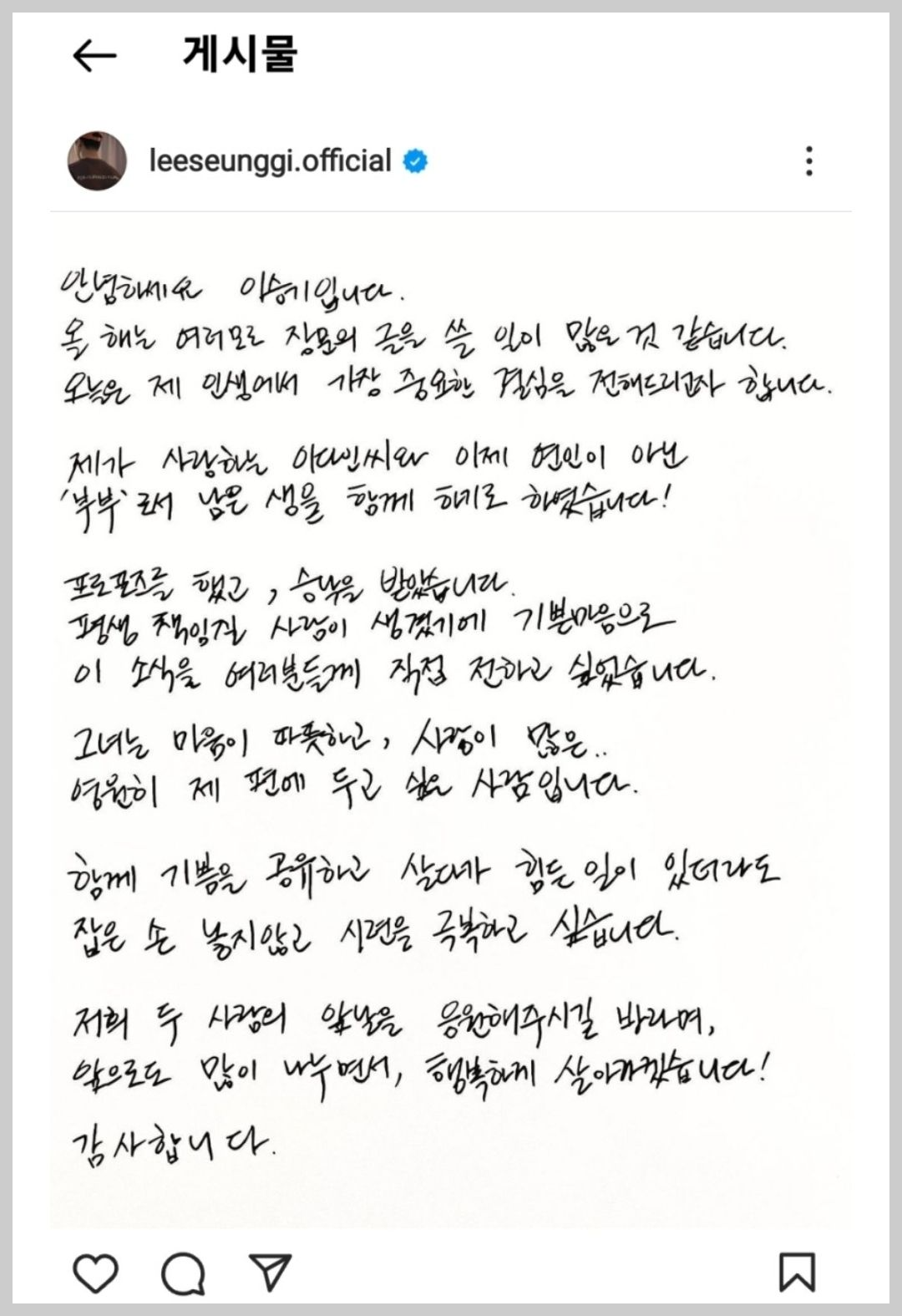결혼소식을 알리는 이승기의 친필 편지는 이승기 공식 인스타그램에서 보실 수 있습니다.