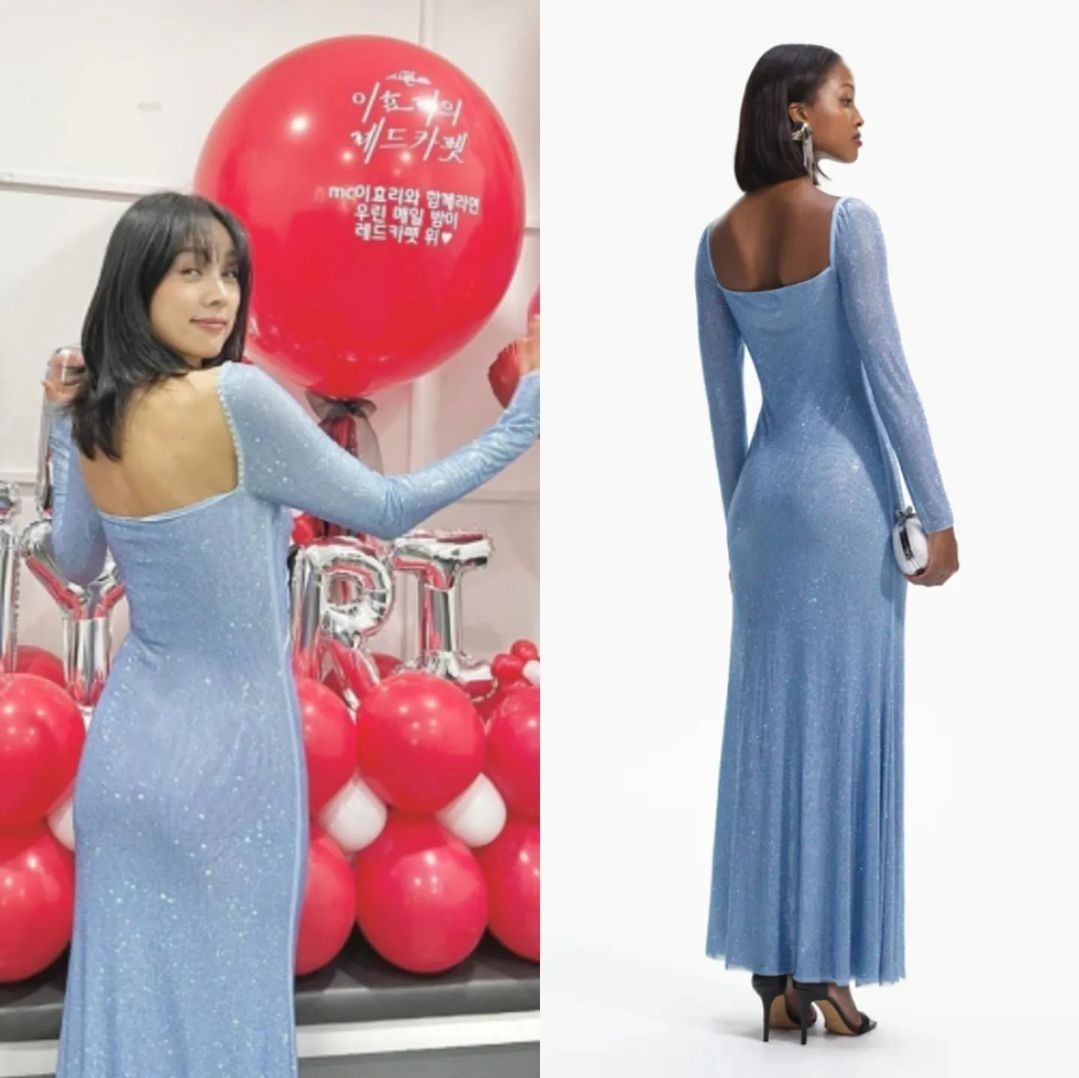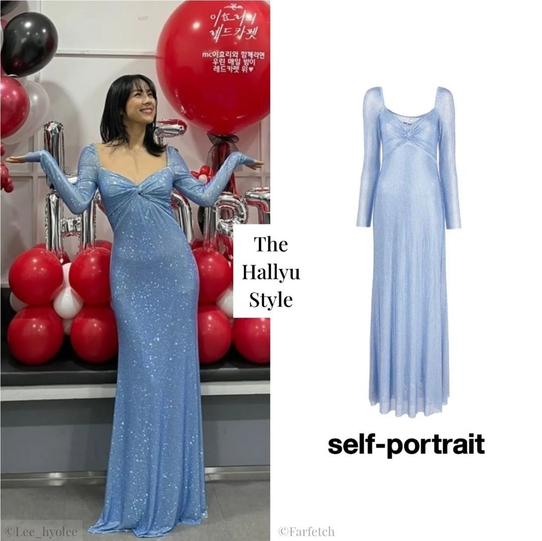 이효리의 레드카펫 첫 방송때 효리가 착용한 드레스는 하늘빛 머메이드 드레스로 그녀의 여전히 날씬한 라인을 돋보여줬습니다.