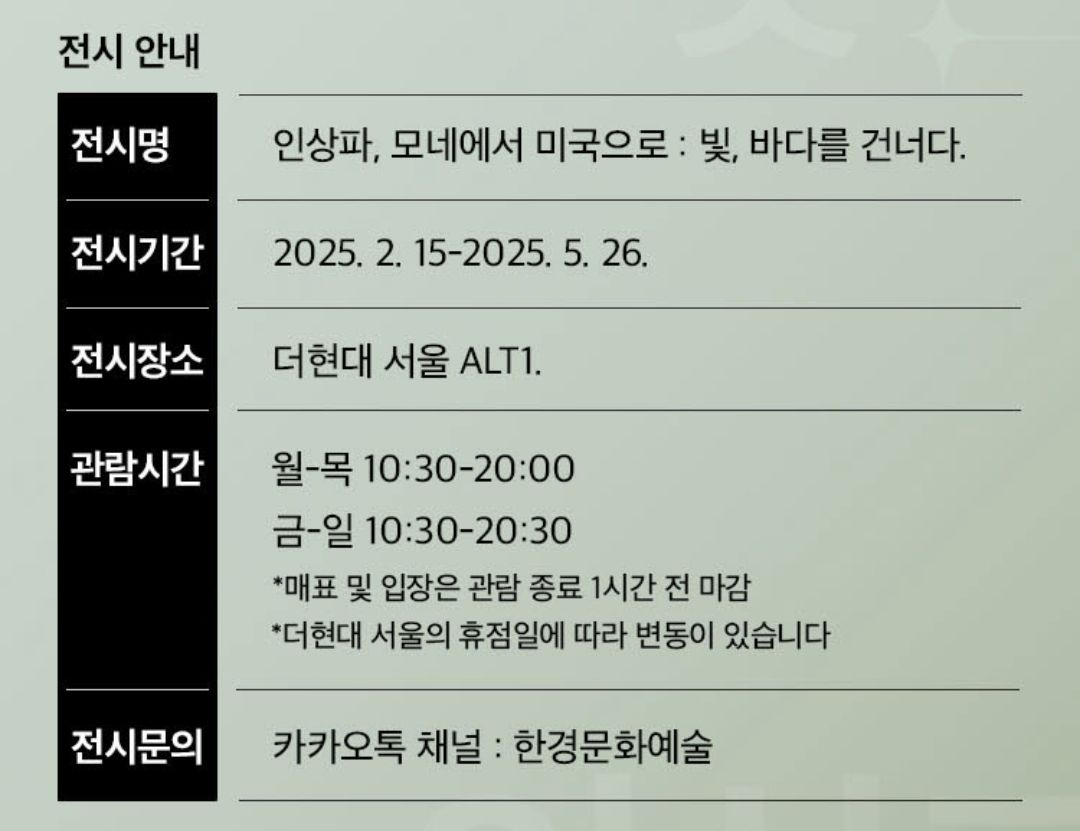한국경제신문이 주최하는 특별전 <인상파, 모네에서 미국으로 : 빛, 바다를 건너다>가 더현대서울 ALT.1에서 개최됩니다.