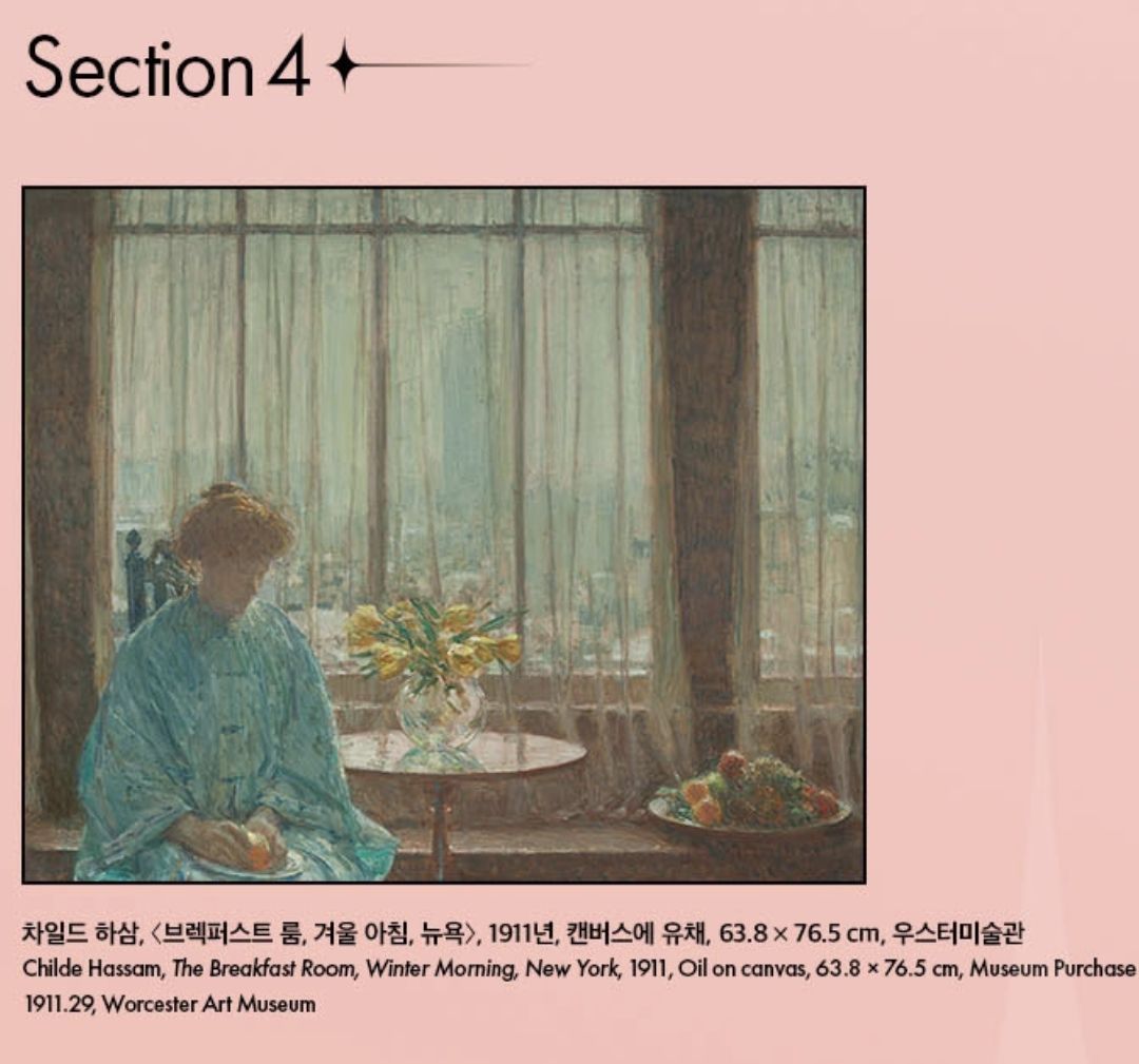 클로드 모네의 <수련>, 카미유 피사로의 <루앙 라크루아섬>, 피에르 오귀스르 르누아르의 <아랍 여인> 등 초기 인상파를 대표하는 거장들의 작품은 물론, 메리 카사트의 <어머니와 아이>, 차일드 하삼의 <프랑스 정원에서 꽃따기> 와 같은 미국 인상주의 대표작들까지 만나볼 수 있어요.
