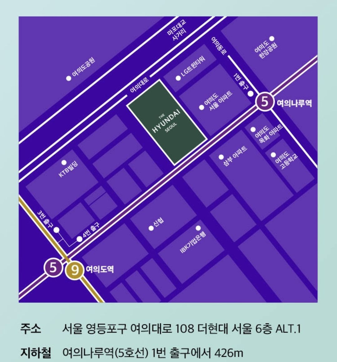전시장인 더현대서울 ALT.1 은 여의나루역 1번출구에서 426m 거리에 있고 더현대서울 백화점 6층에 있습니다.
