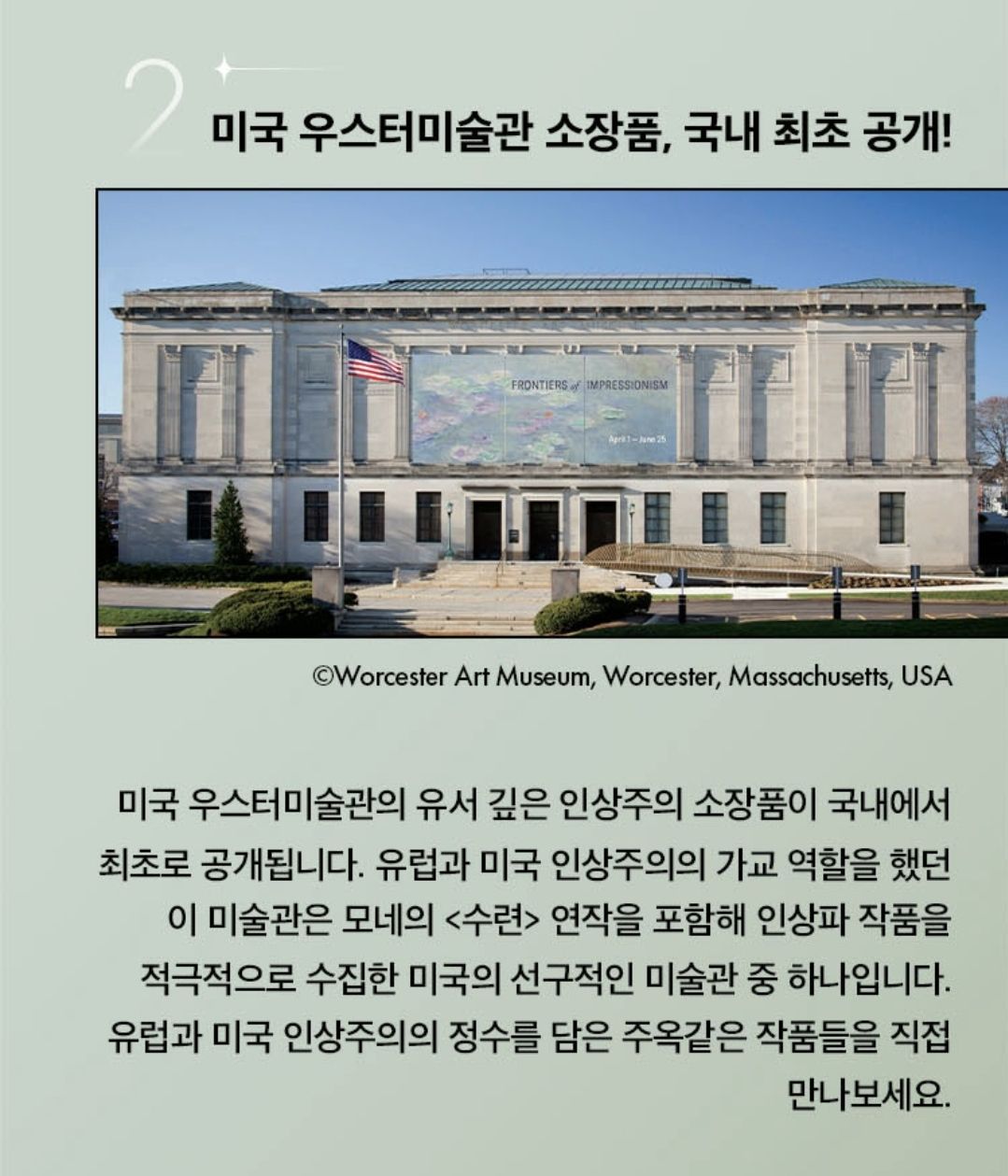 이번 전시는 국내 최초로 공개되는 미국 우스터미술관에서 엄선된 인상파 유화 원화 53점을 통해, 프랑스에서 시작된 인상주의가 유럽과 미국으로 확산되며 미술사에 끼친 영향을 탐구합니다.