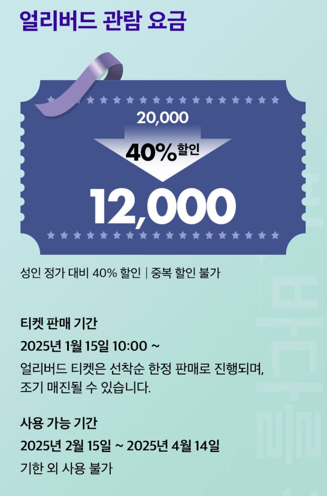 성인 기준 정가 20,000원에서 40% 할인된 12,000원으로 구매가능하고, 다른 혜택들과 중복 할인은 불가합니다.