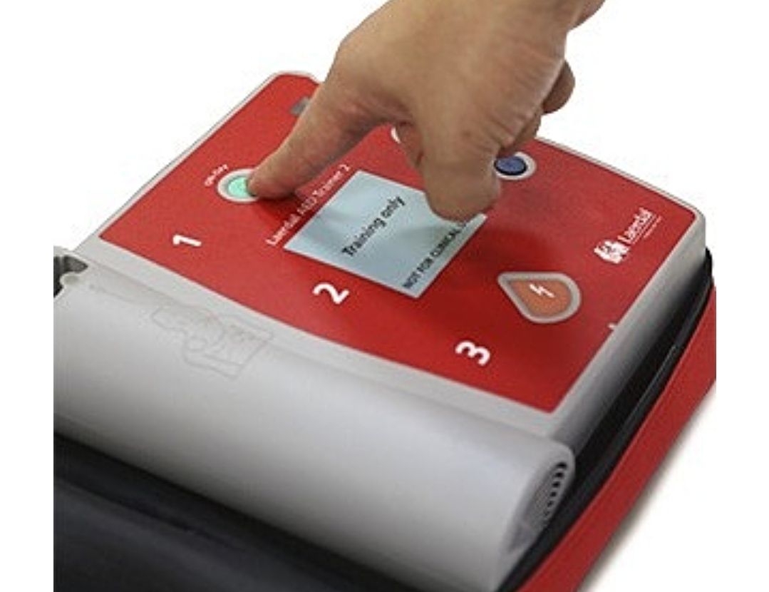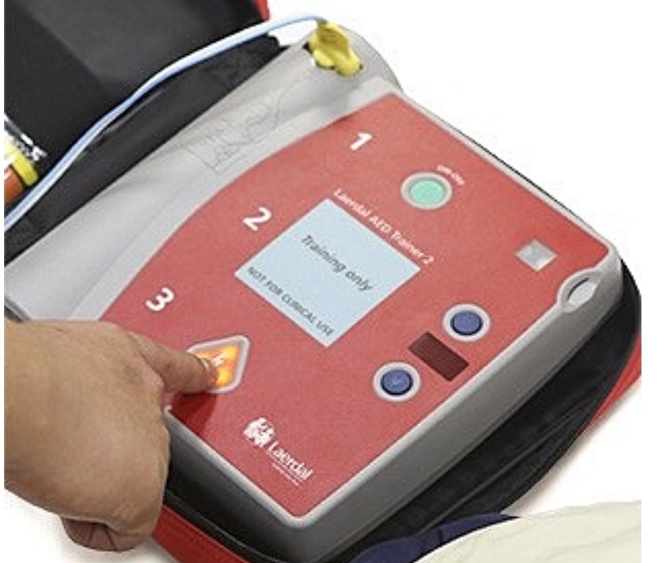 자동 심장충격기의 전원을 켭니다. 전원이 들어오면 음성이 나오면서 절차를 안내해줍니다.