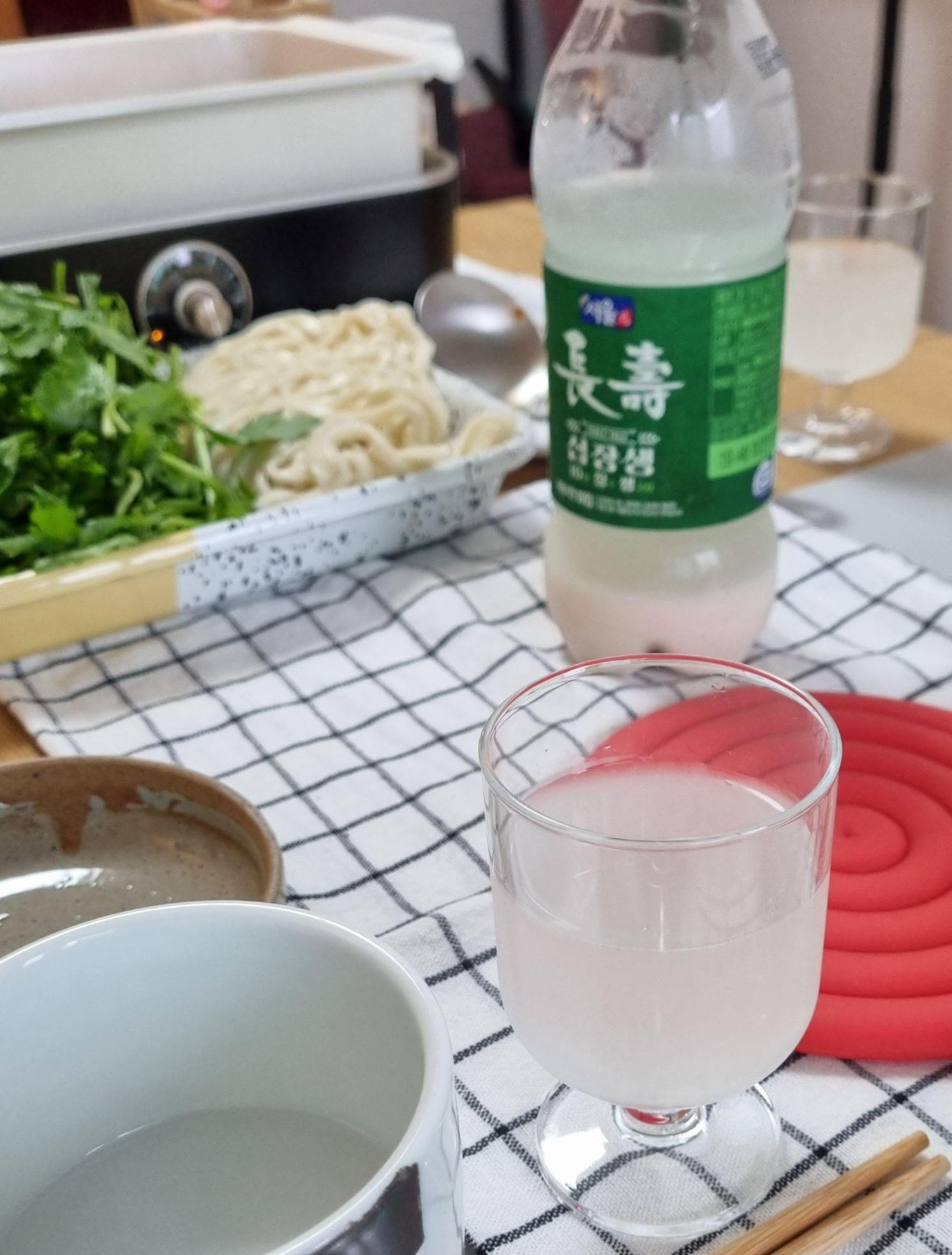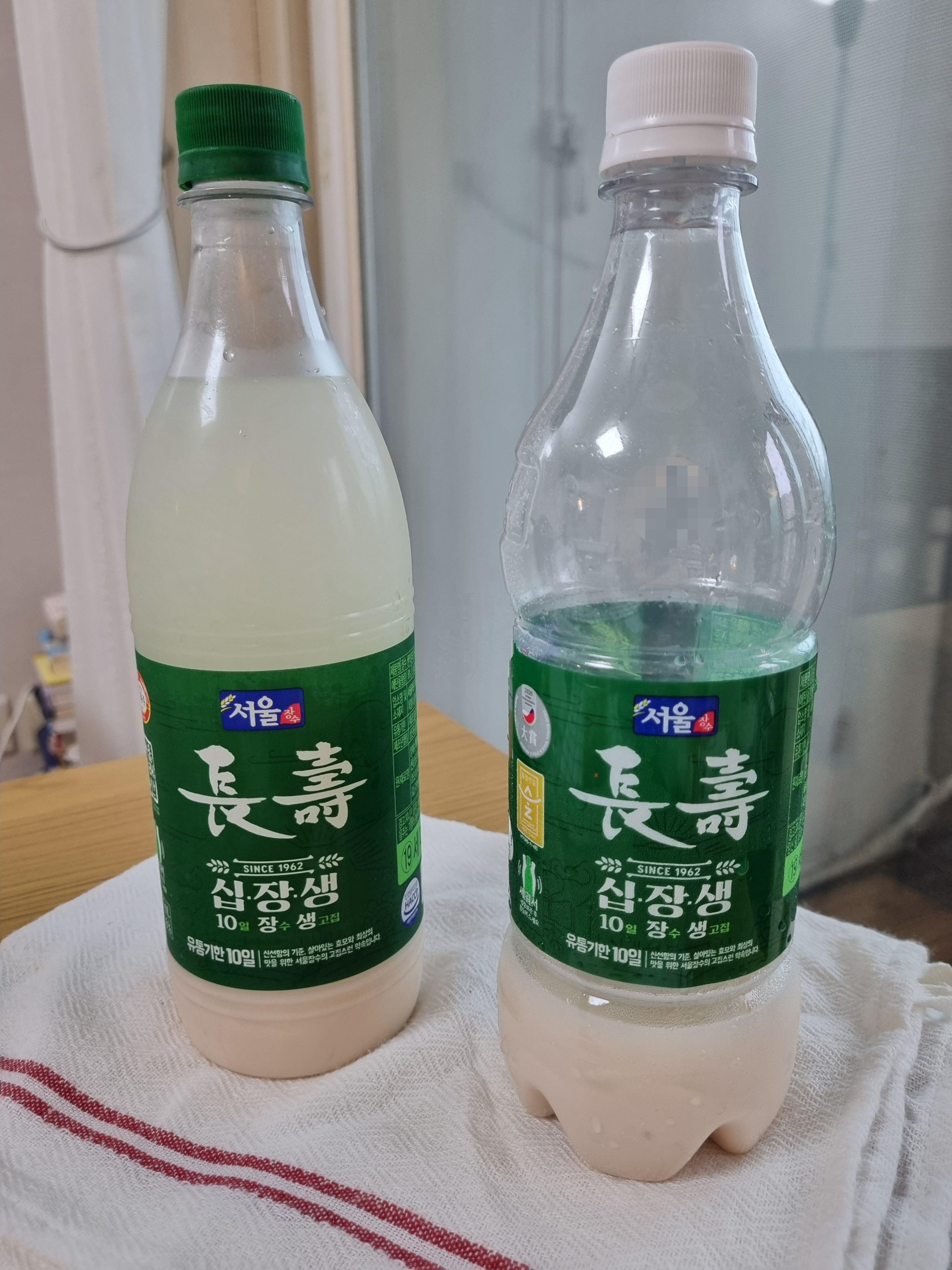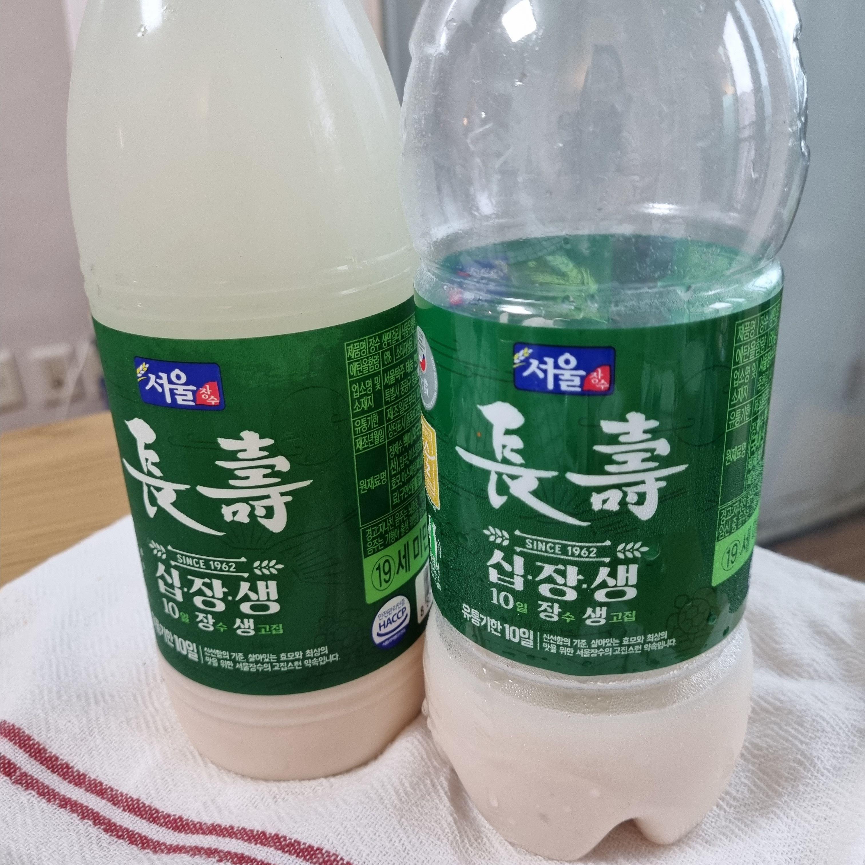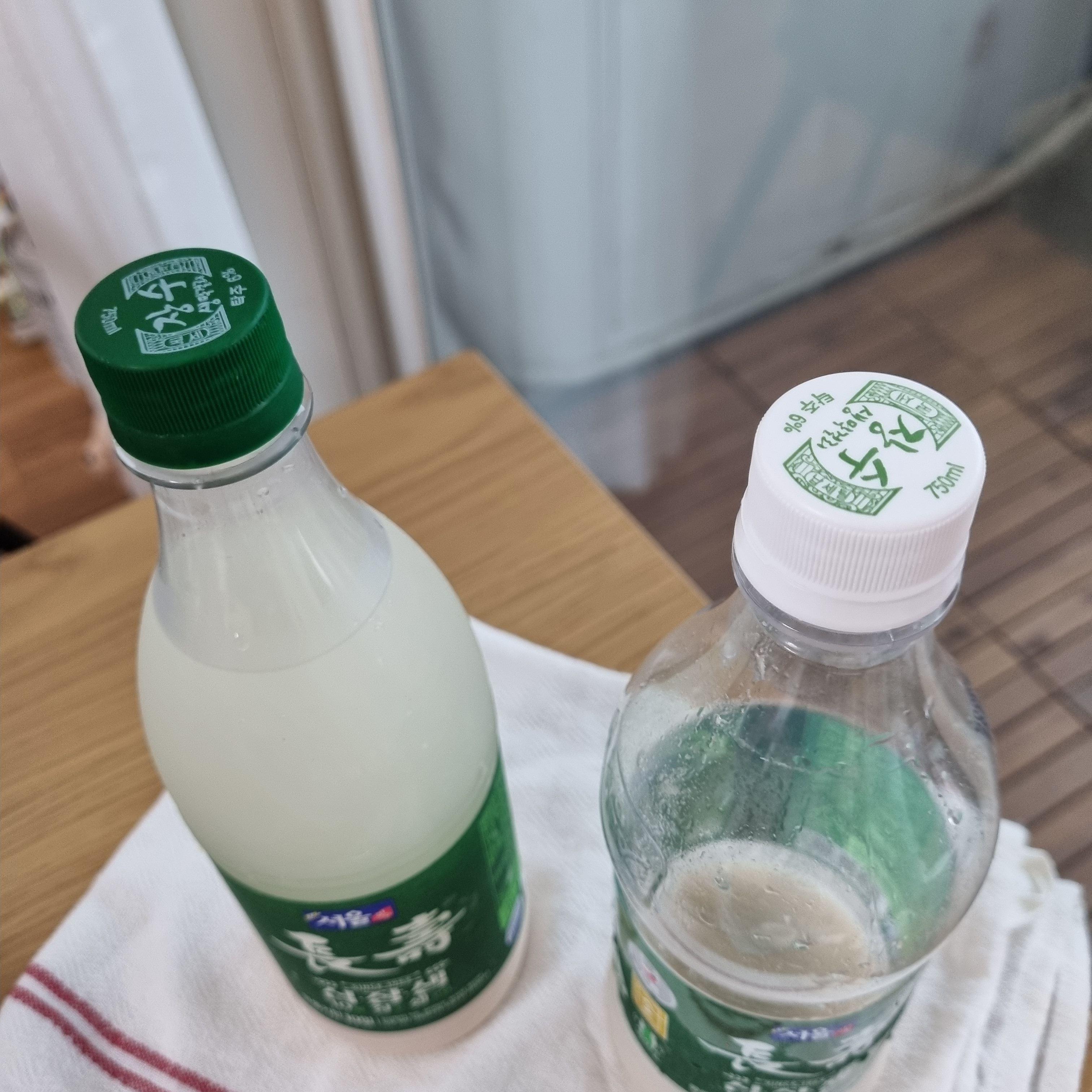 맛은 흰색뚜껑의 막걸리가 깔끔하고, 초록색 뚜껑의 장수막걸리가 살짝 더 단맛이 느껴졌는데요, 이건 제조과정에서 그런건지 원래 외국산 쌀의 맛이 단건지는 잘 모르겠습니다. 저희는 막걸리 바닥에 가라앉은 걸 섞지 않고 투명한 윗부분(?)만 마시는 스타일이다보니 맛의 차이를 더 잘 느꼈던 것 같아요.