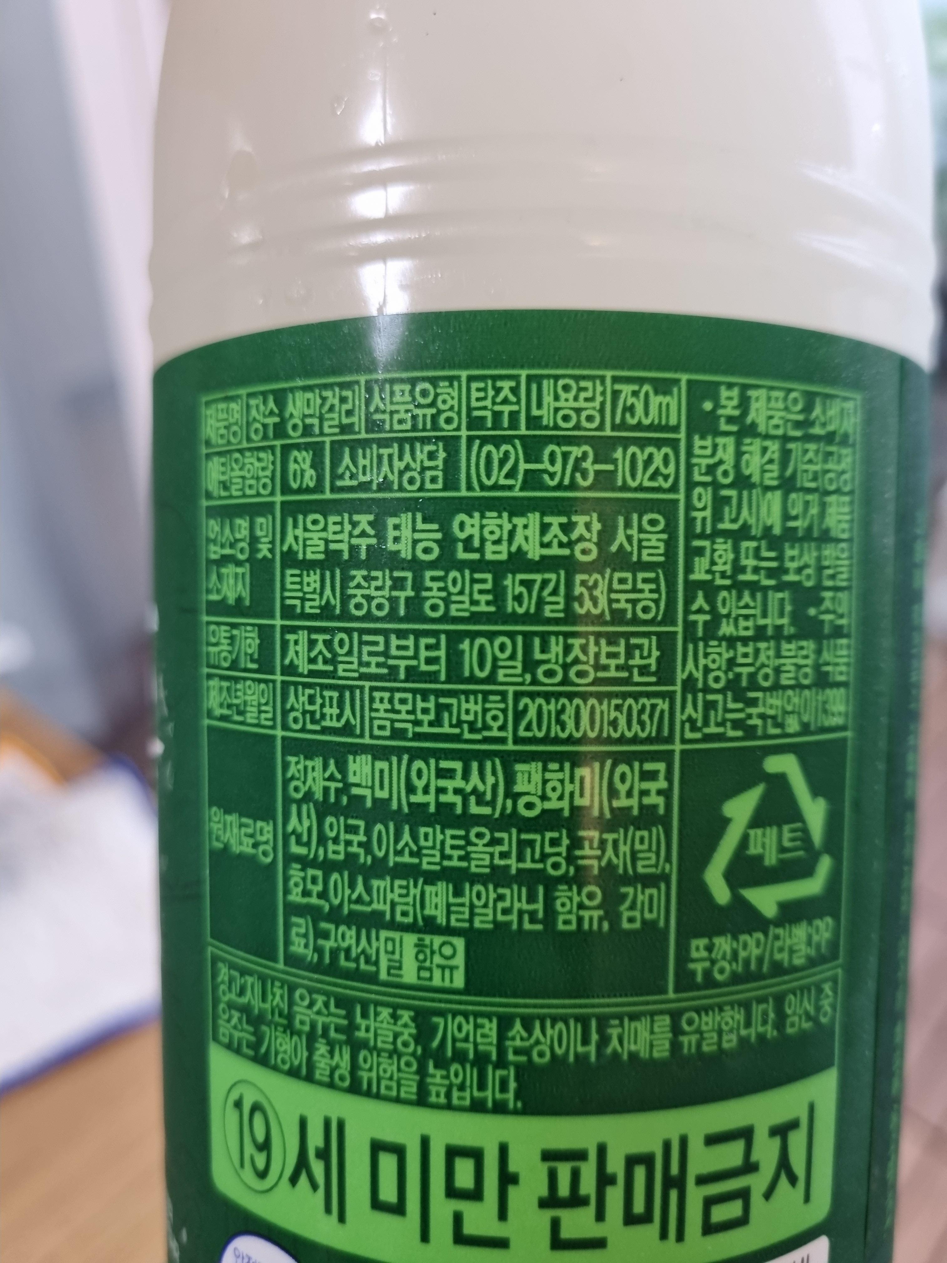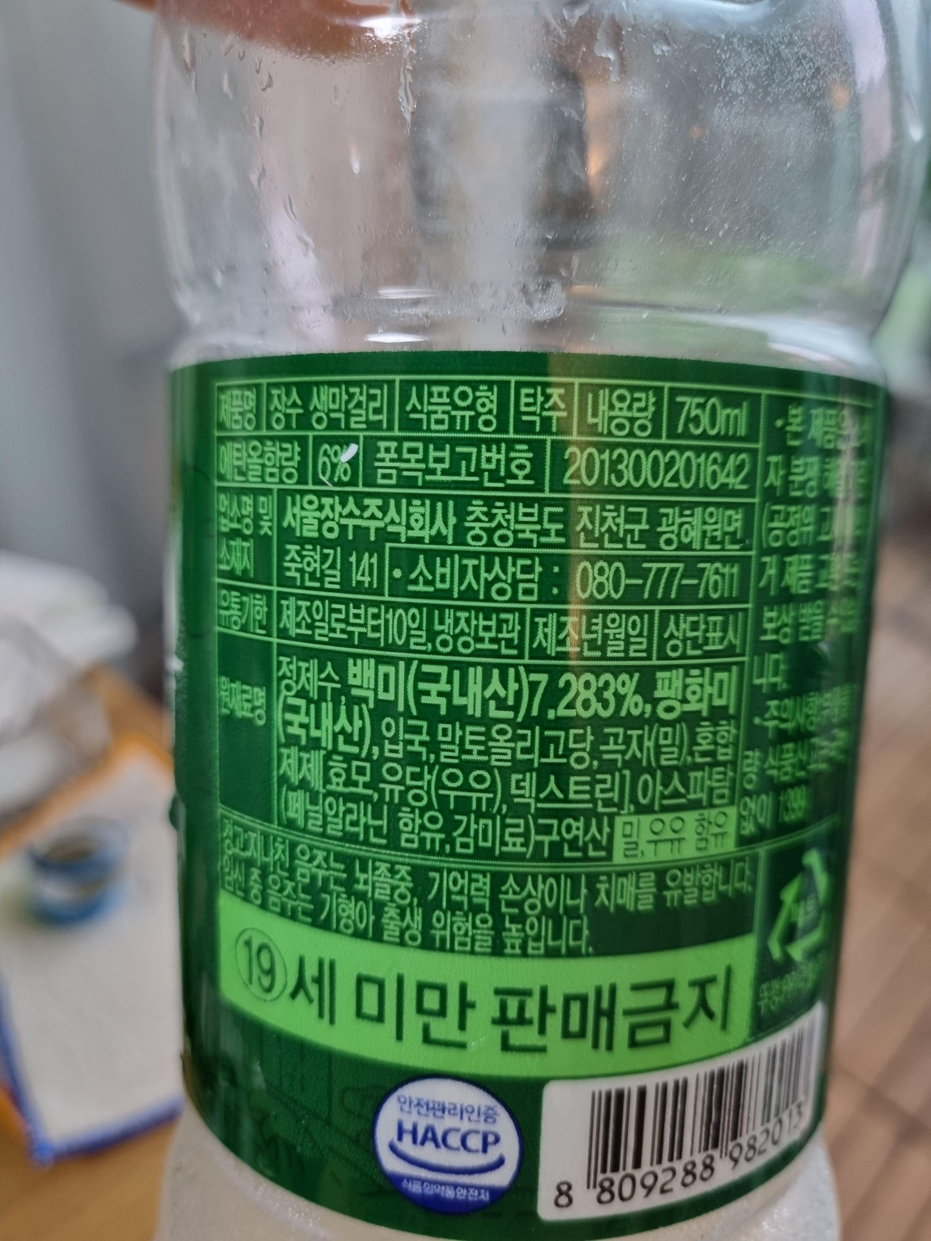 초록색 뚜껑 장수막걸리의 성분