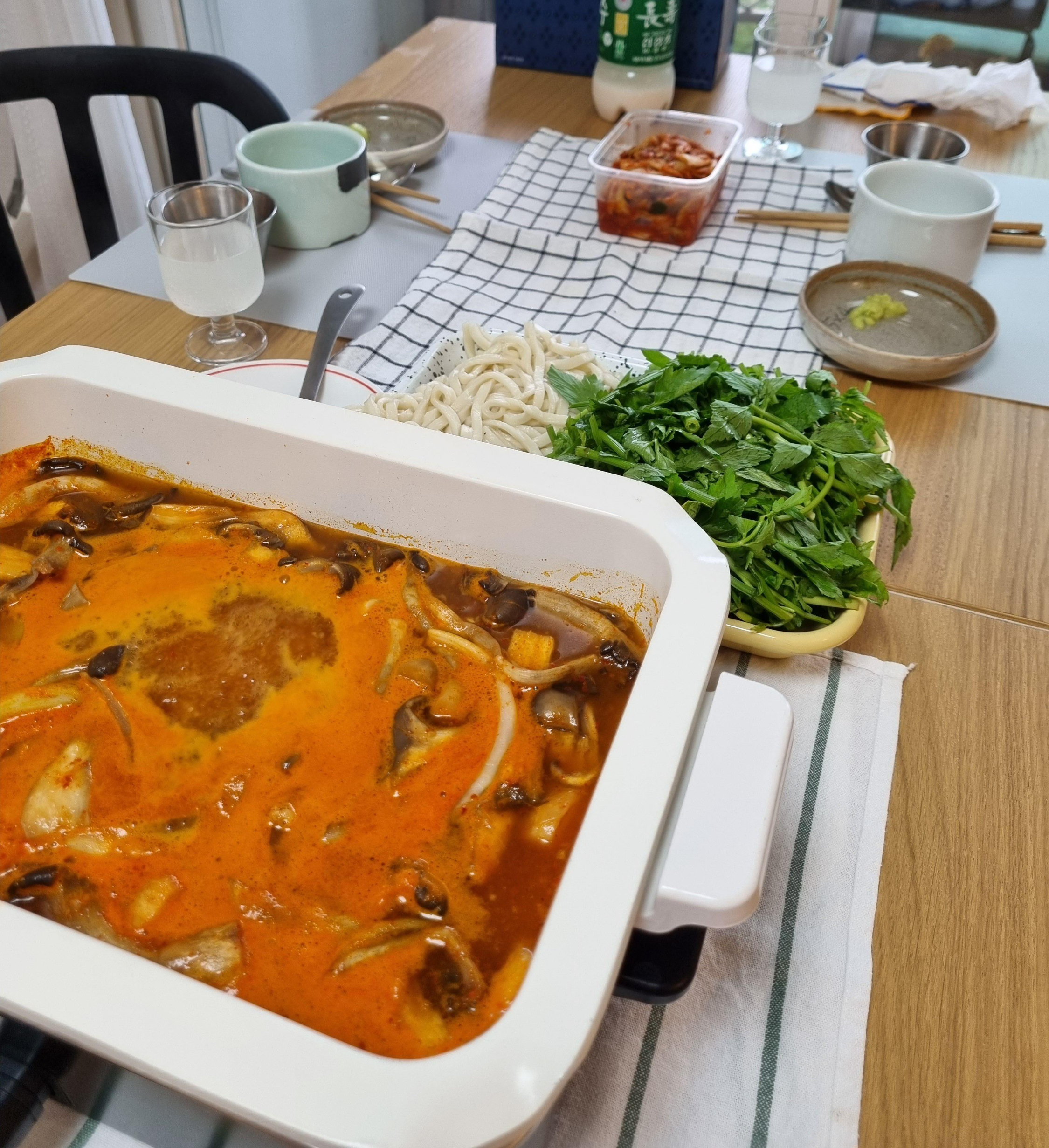 등촌샤브샤브에서 버섯칼국수 2인분을 포장해와서 집에서 끓이면서 먹었어요. 포장해주신 2인분이 양이 정말 많아서.. 행복했습니다.