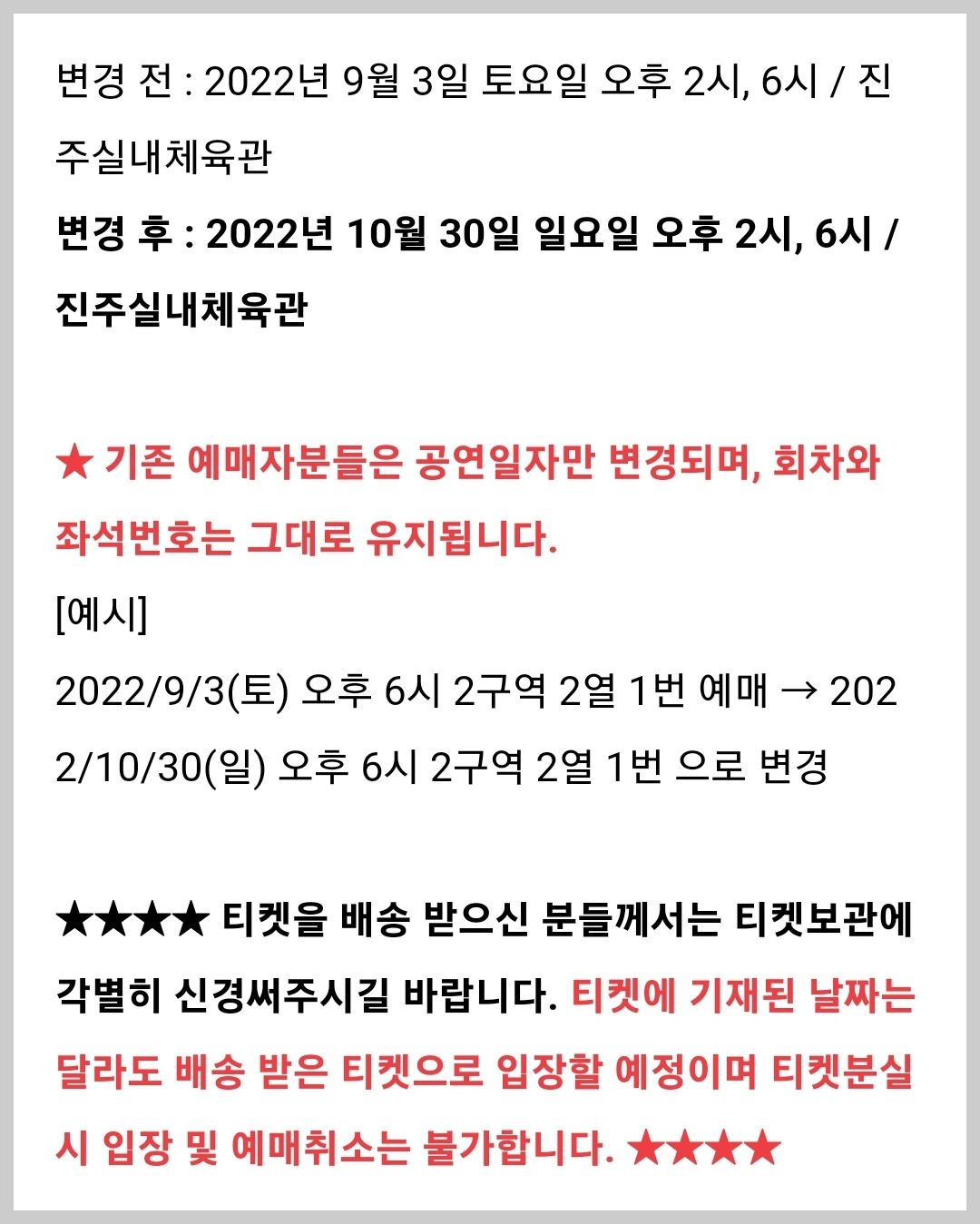 - 배송받은 티켓은 어떠한 사유로도(분실, 도난, 훼손, 미소지) 재발권되지 않으니 티켓보관에 유의