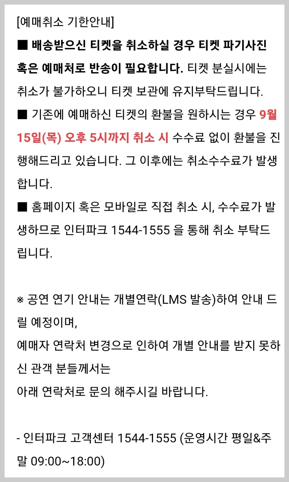 - 티켓이 배송된 이후에는 인터넷 취소가 불가하며 배송받으신 티켓을 구매하신 예매처로 반송하여 접수가 완료된 후에 취소가능