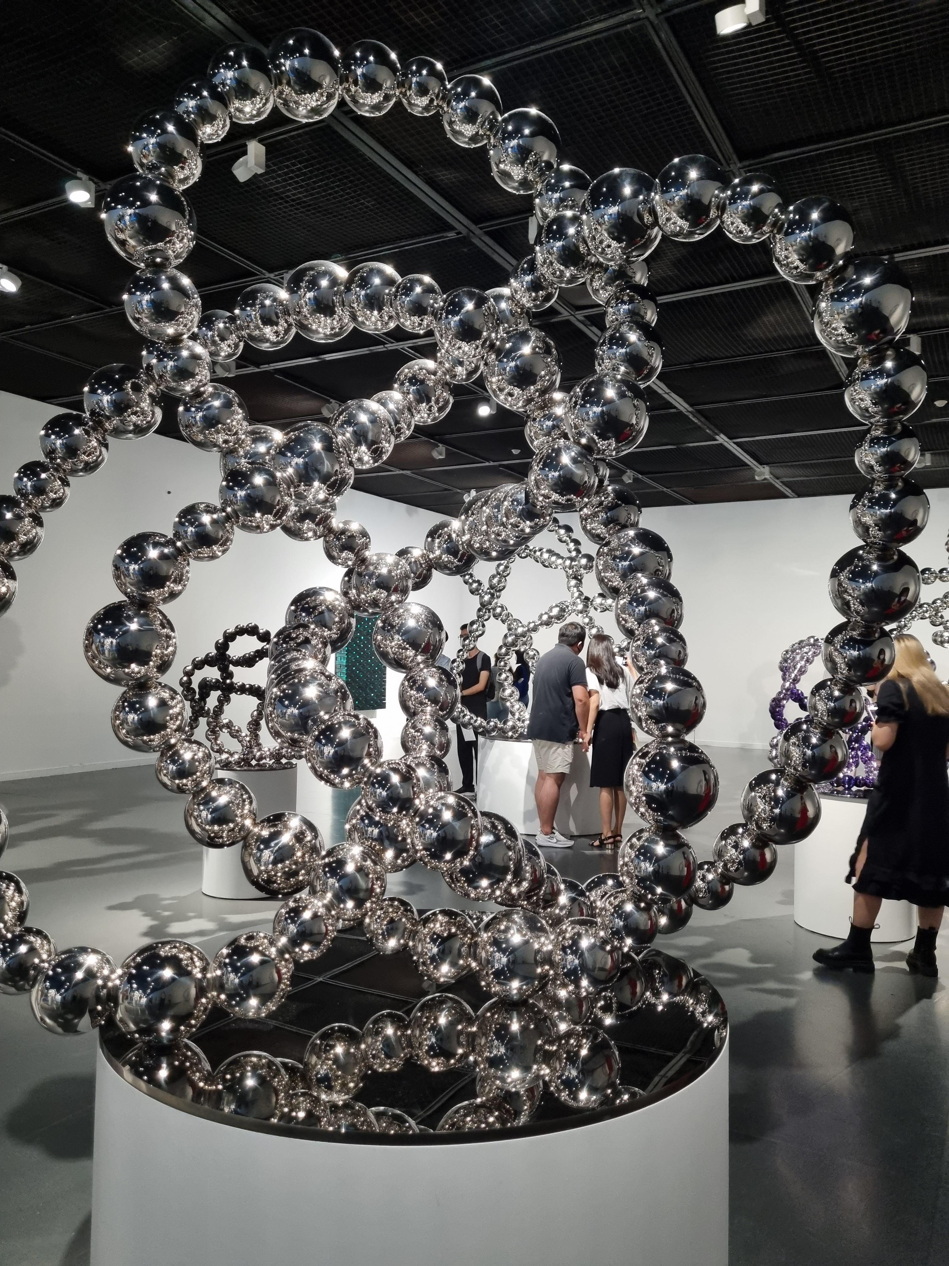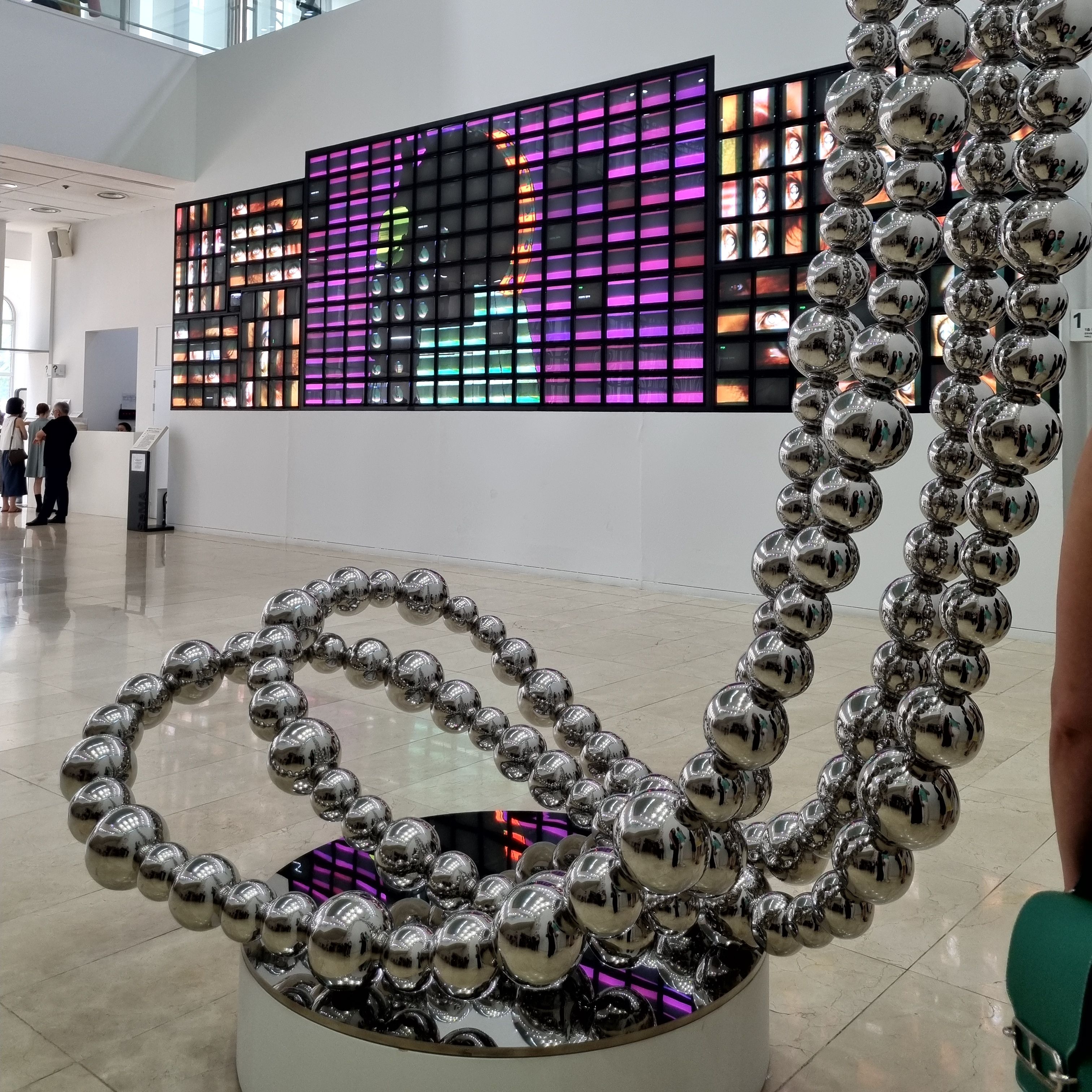 전시장 안으로 들어오면 장미셸 오토니엘 전시를 보러 오신 꽤 많은 인파를 만날 수 있는데요, 줄을 서서 천천히 입장합니다. 입장하는 곳에서도 은색구슬모양의 작품이 있구요, 벽면에 백남준작가의 미디어작품이 눈을 사로잡습니다.