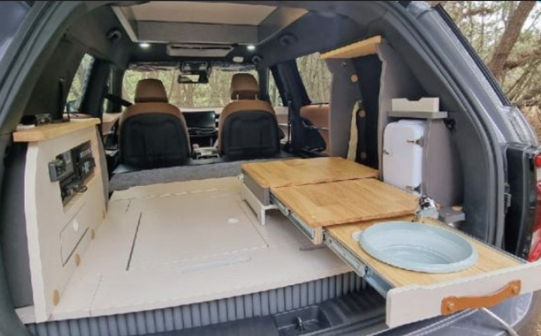 차 내부에 다양한 캠핑에 필요한 장비들이 설치되어 있어요.