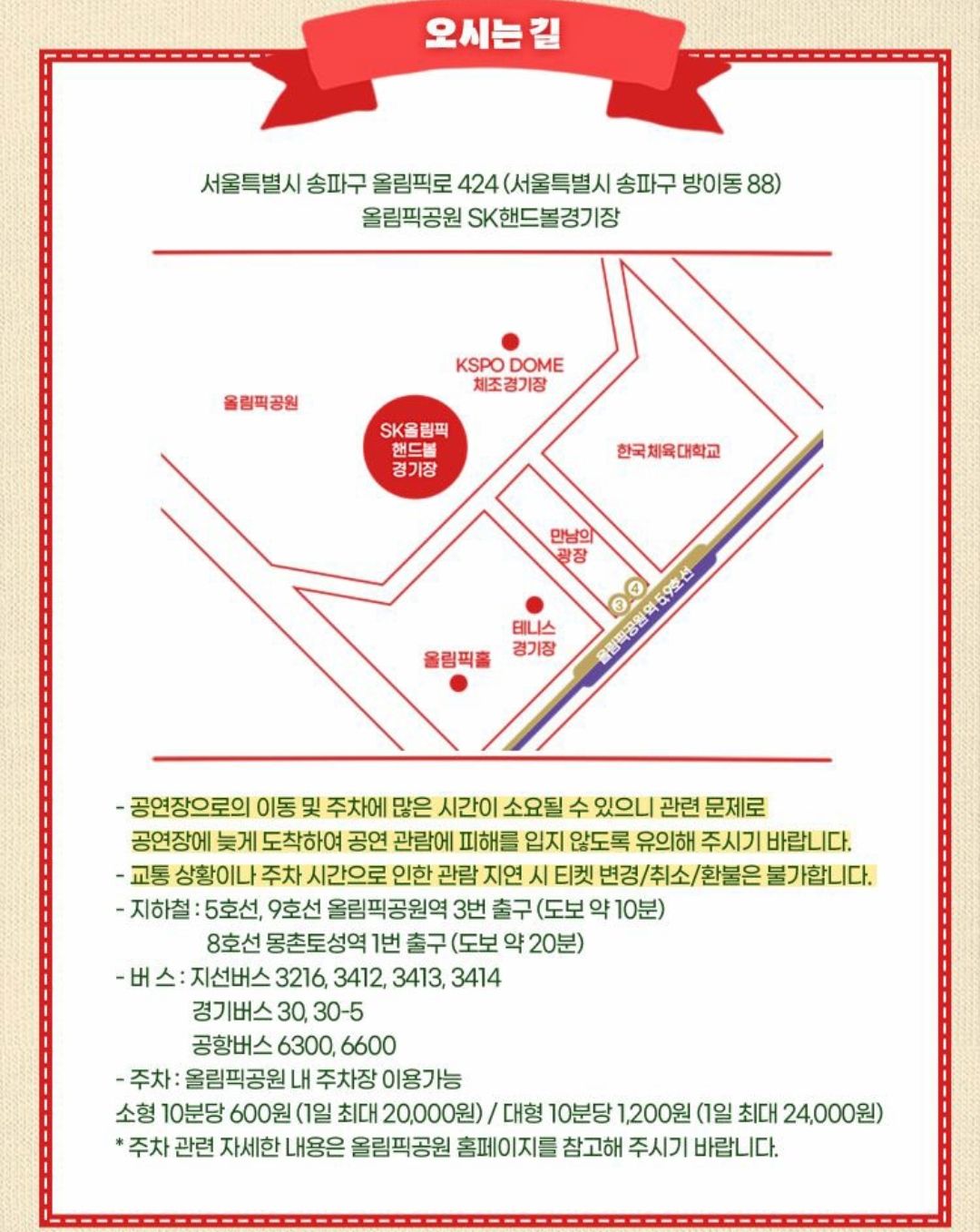 정동원 크리스마스 콘서트 공연장인 올림픽공원 SK핸드볼경기장 주차장은 공연장으로의 이동 및 주차에 많은 시간이 소요될 수 있으니 이와 관련해 공연장에 늦게 도착하시거나 주차 시간으로 관람 지연시 티켓 변경, 취소, 환불은 불가합니다.