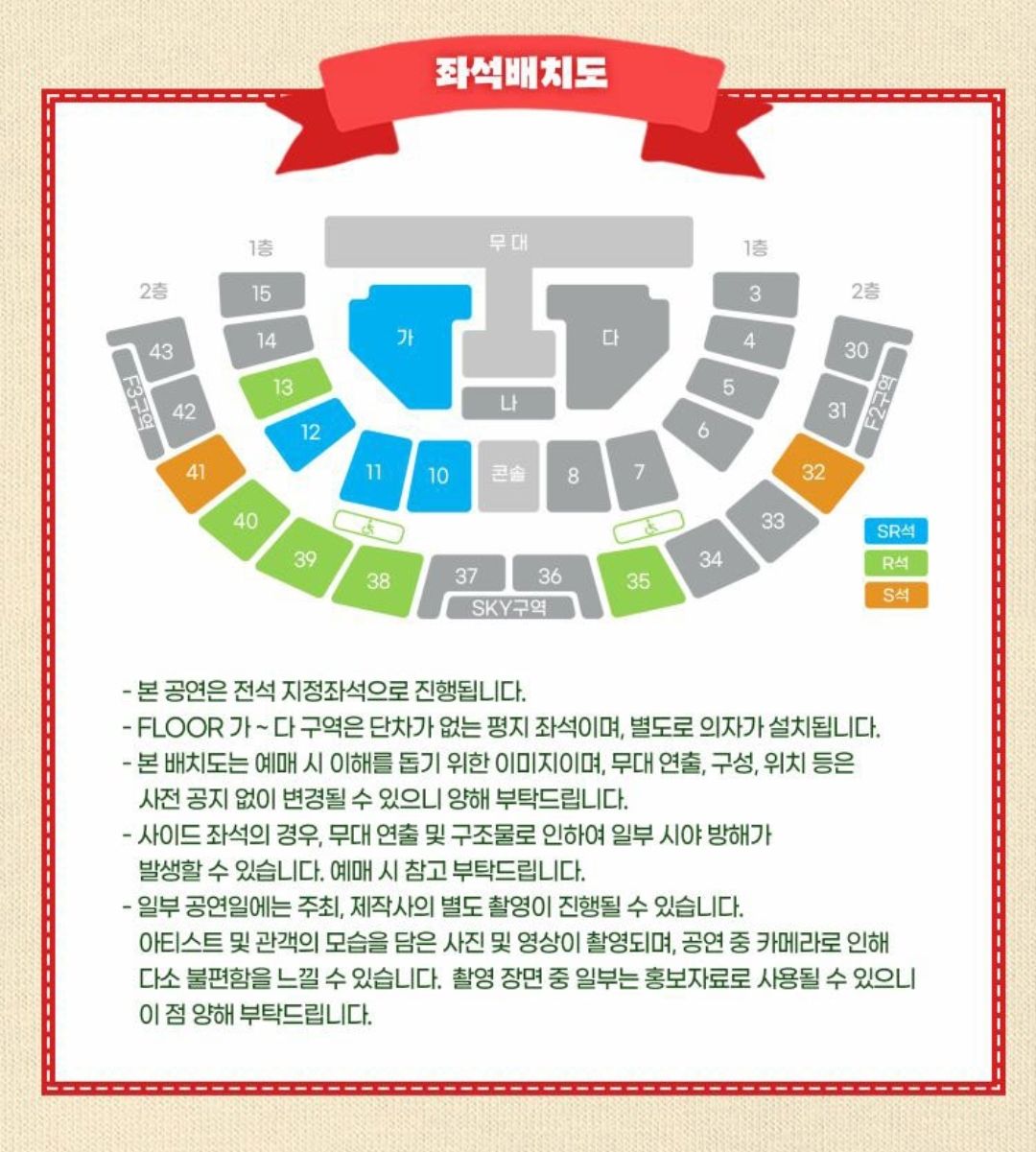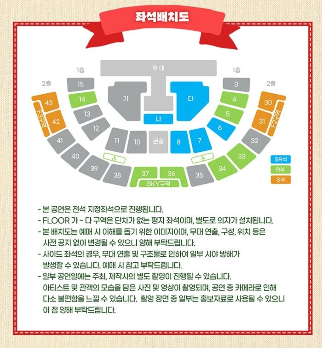 모든 좌석이 지정석으로 진행되고, 가~다 구역은 단차가 없는 평지 좌석이며 별도로 의자가 설치됩니다.