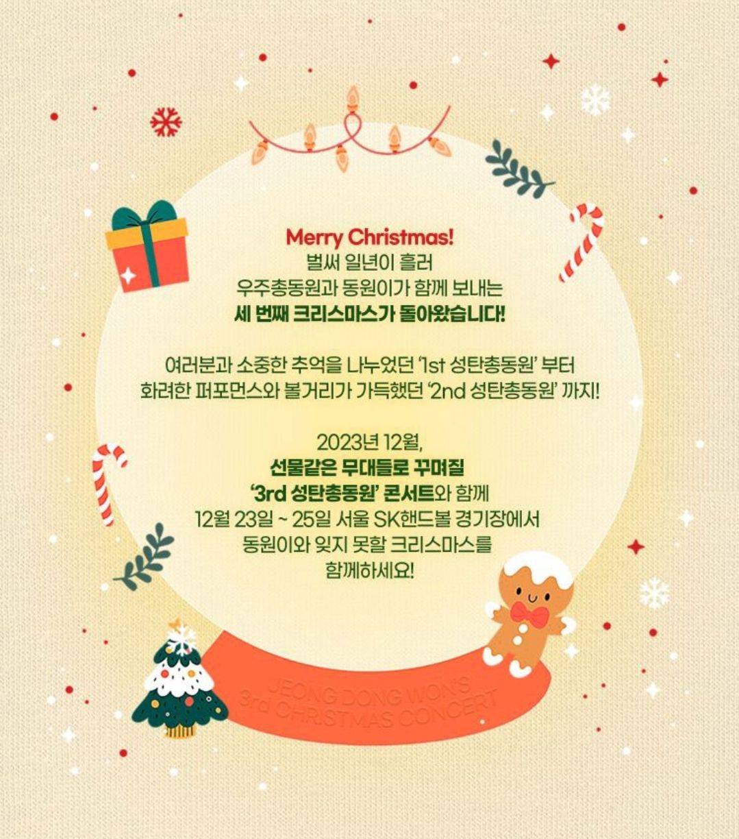 12월 23일부터 25일까지 올림픽공원 Sk핸드볼경기장에서 총 3회 개최되는 콘서트 '성탄총동원'은 지난 9월 20일 발매한 정동원의 미니 앨범 수록곡들을 비롯한 다채로운 무대를 선보일 예정이라고 합니다.