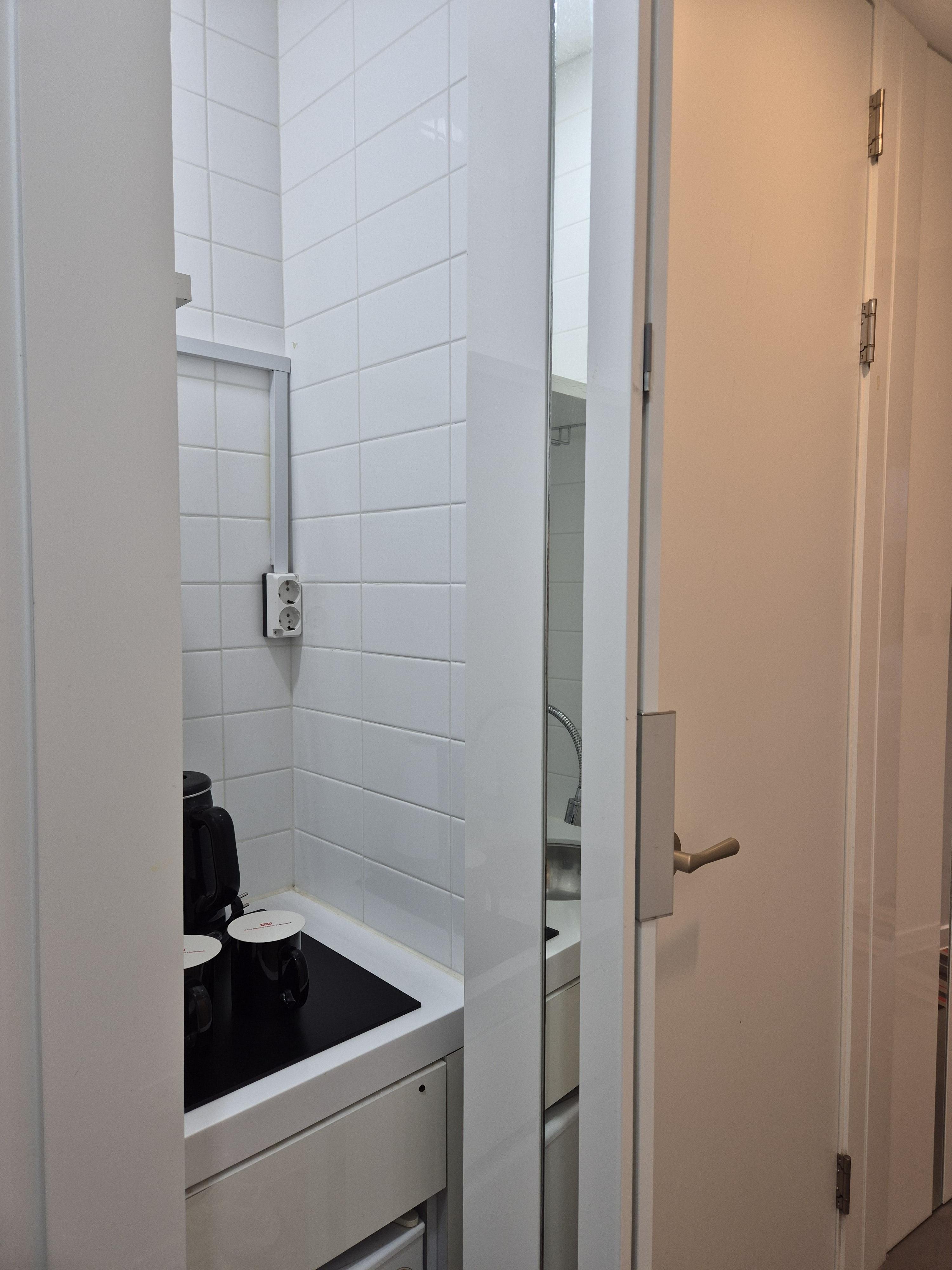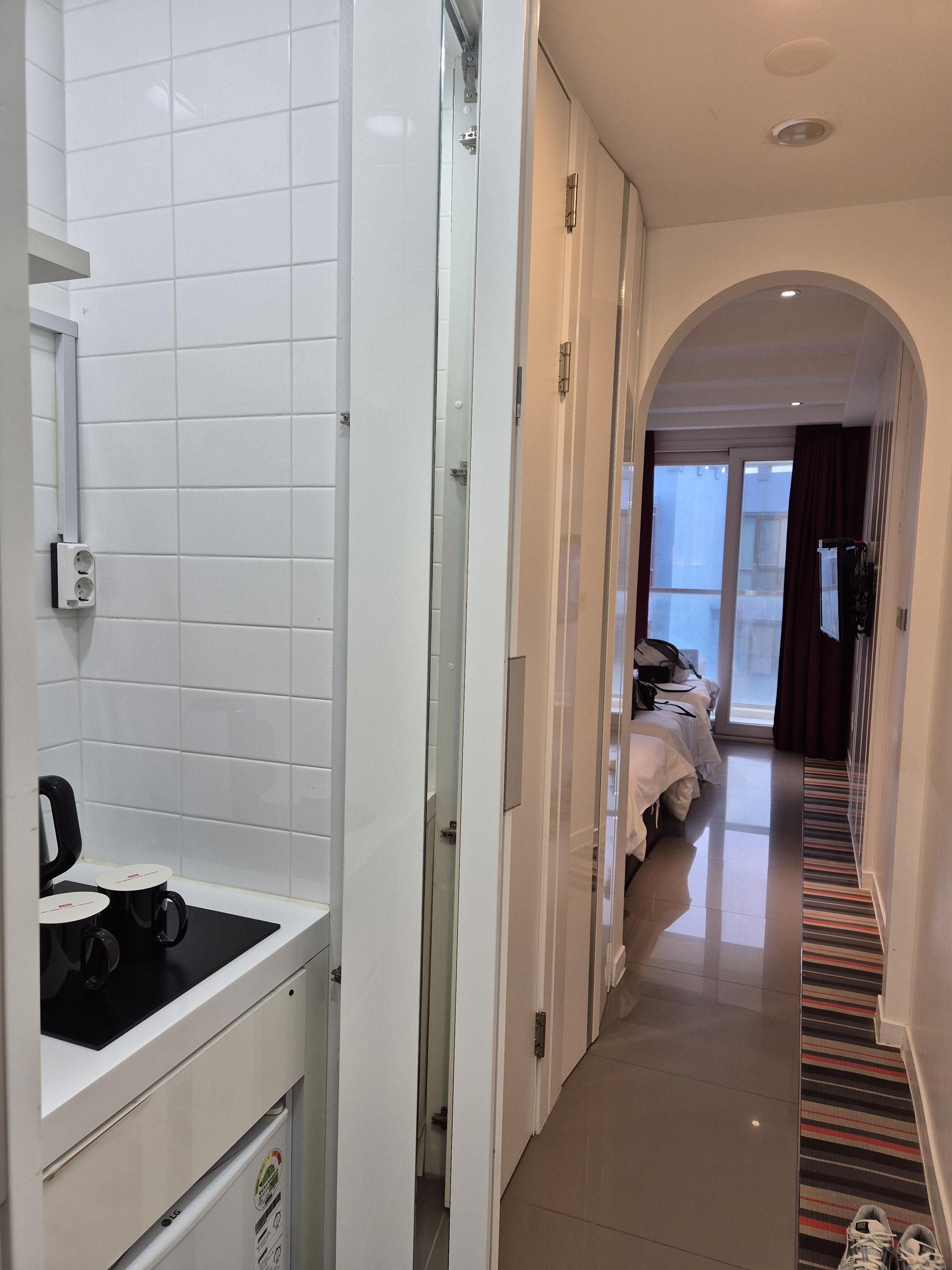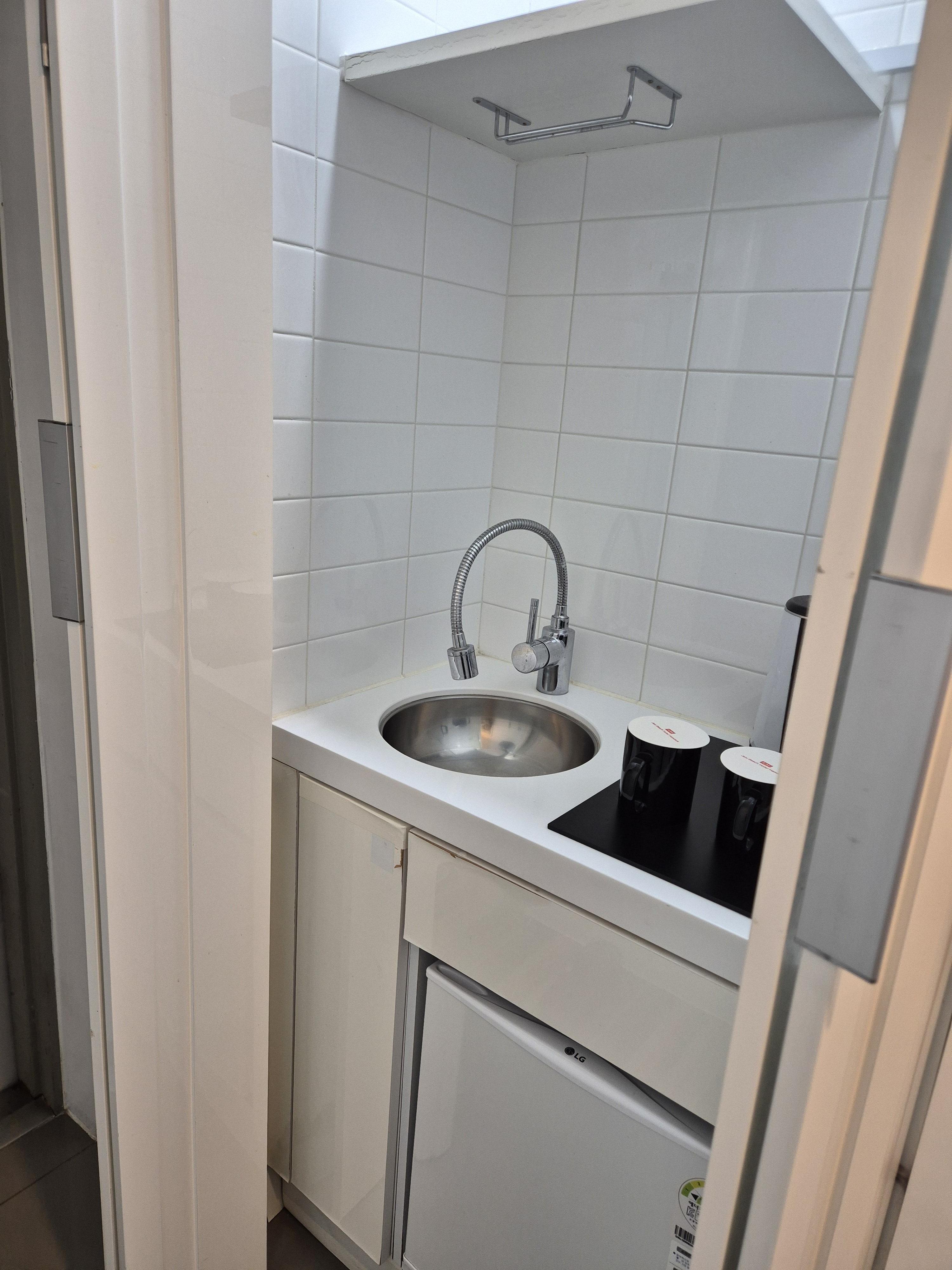 냉장고와 커피포트, 잔 등이 있는 작은싱크대가 나옵니다.