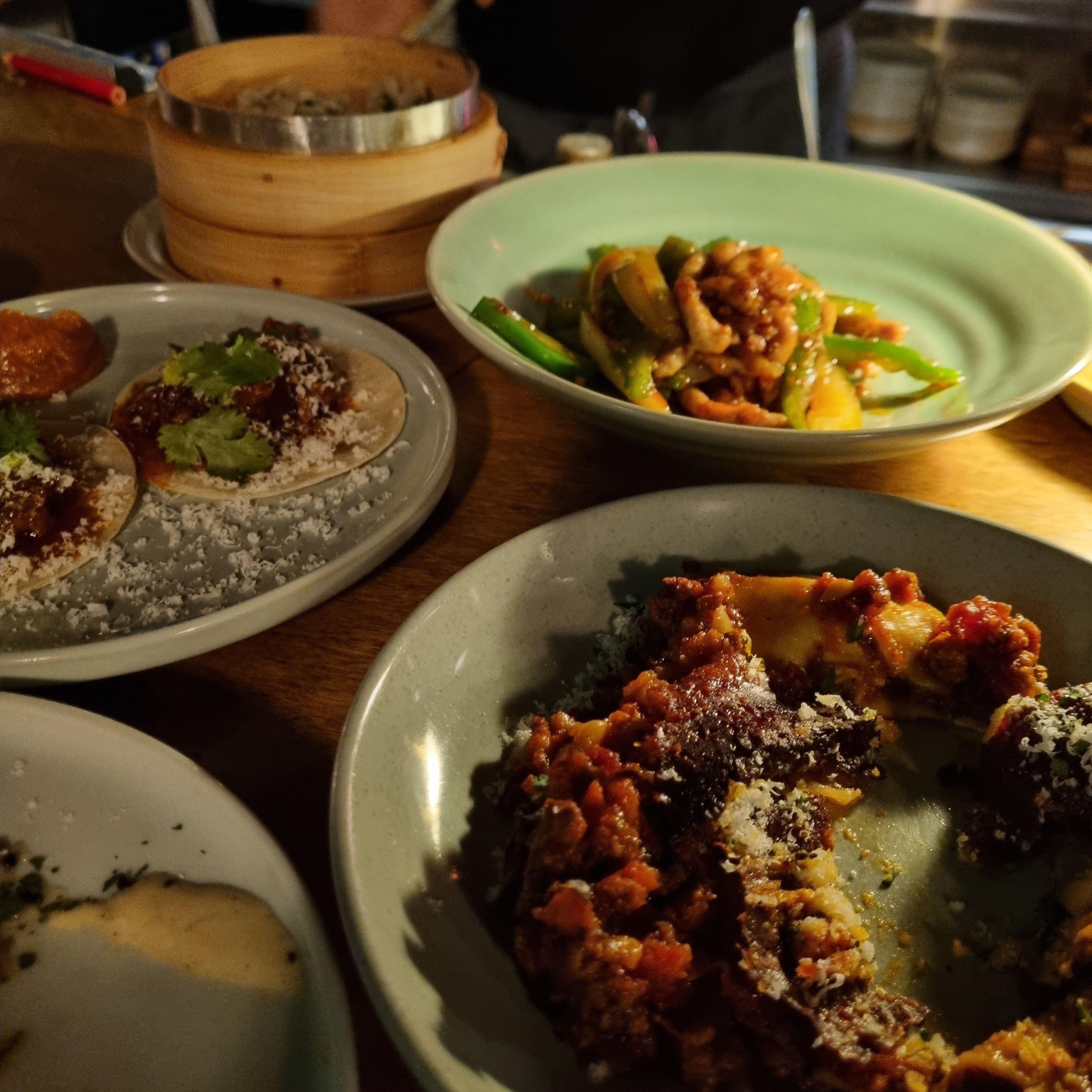 또띠아에 고기와 미트소스, 치즈가 올려진 타코.