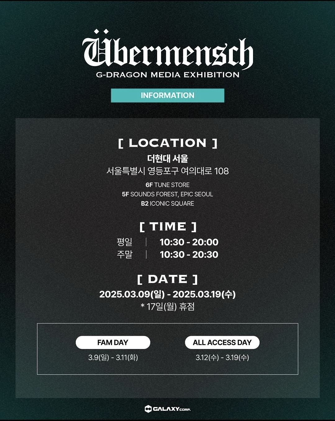 가수 G-DRAGON(지드래곤)이 3월 9일부터 서울 여의도 더현대 서울에서 특별한 미디어 전시회 <위버맨쉬>를 3월 19일까지 진행중입니다.